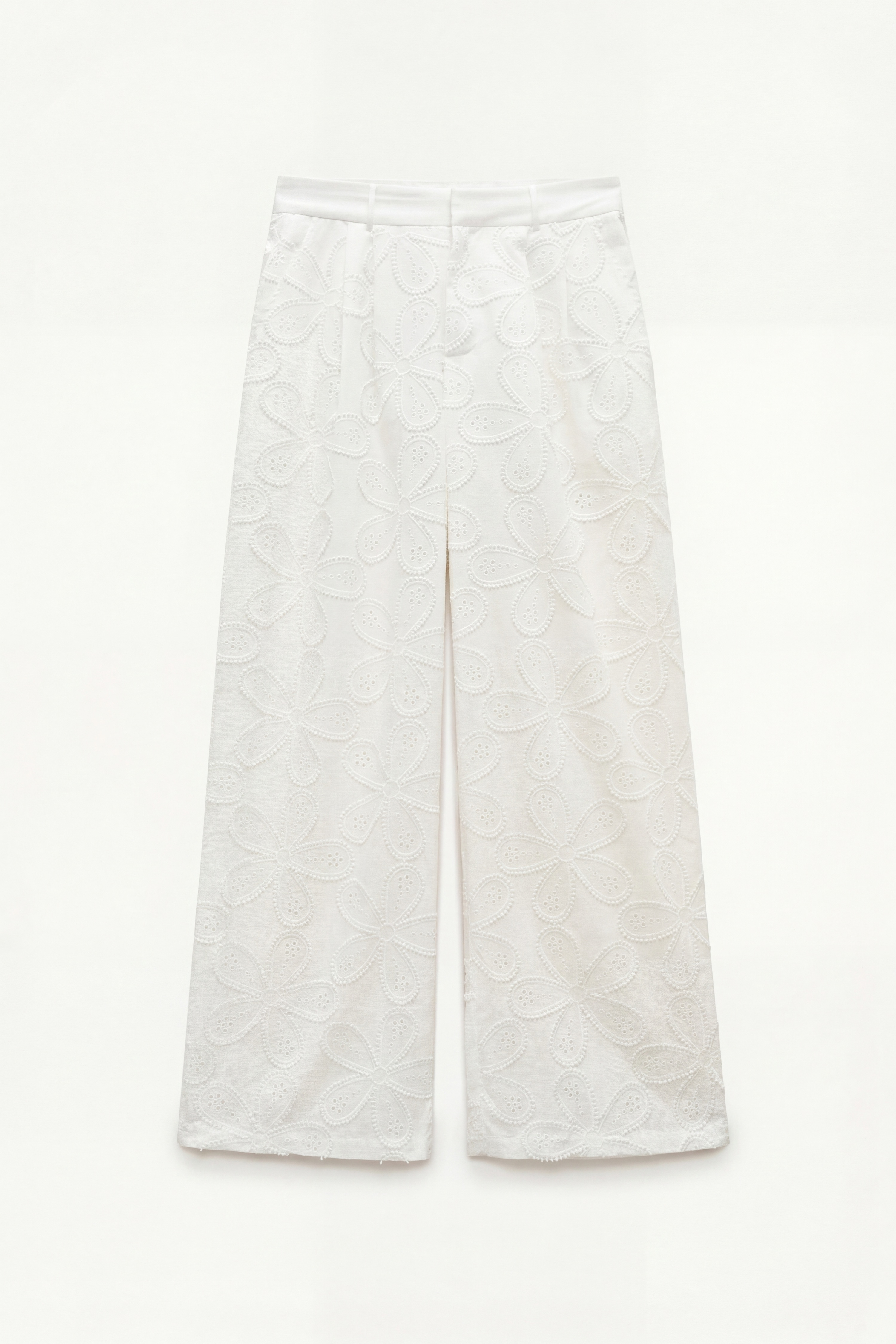 Pantaloni in sangallo con motivo floreale. Vita alta con passanti per cintura. Tasche laterali funzionali. Tasche posteriori a filetto. Chiusura frontale con cerniera, gancio e bottone. Vestibilità regolare, disponibile in taglia S, M, L.