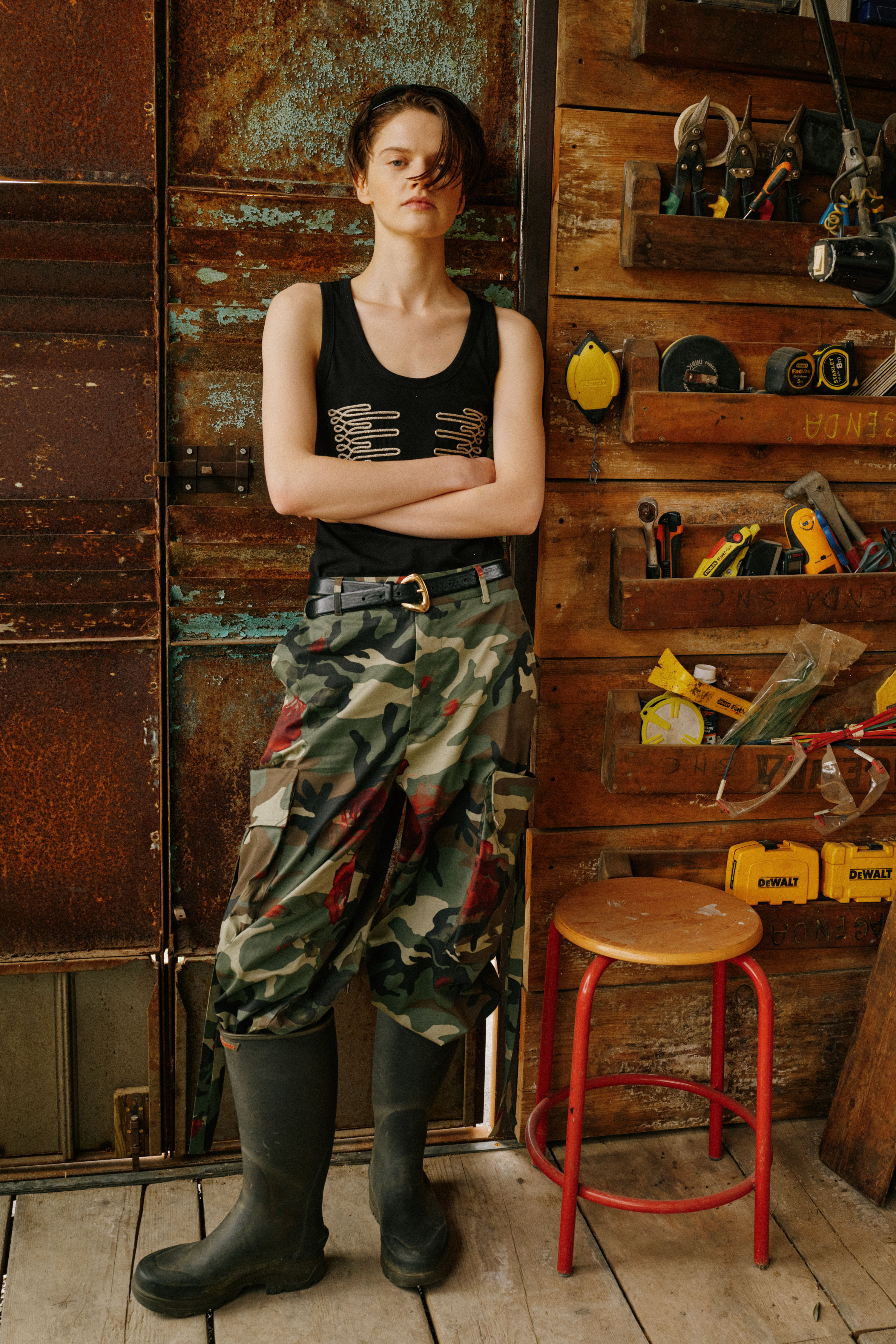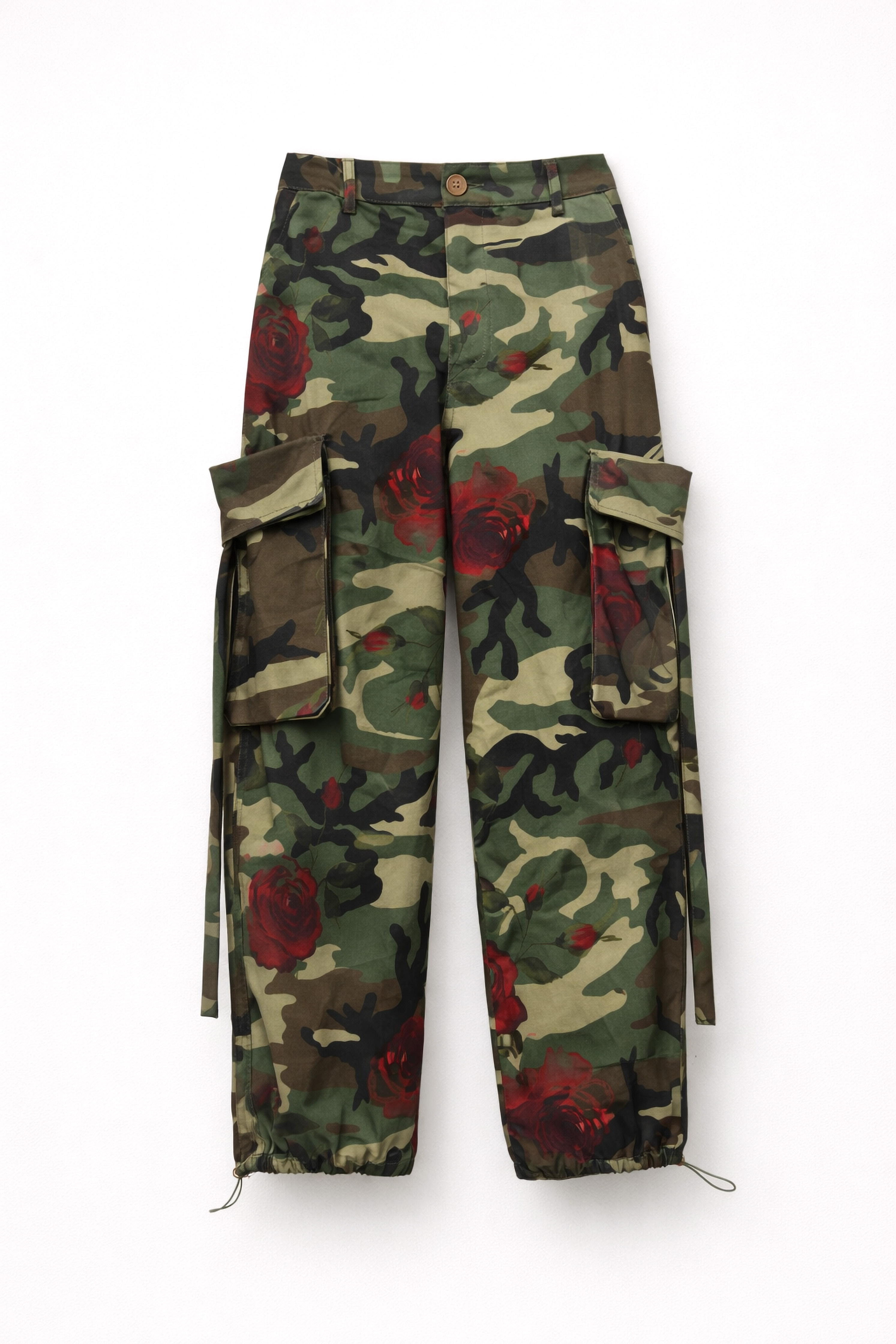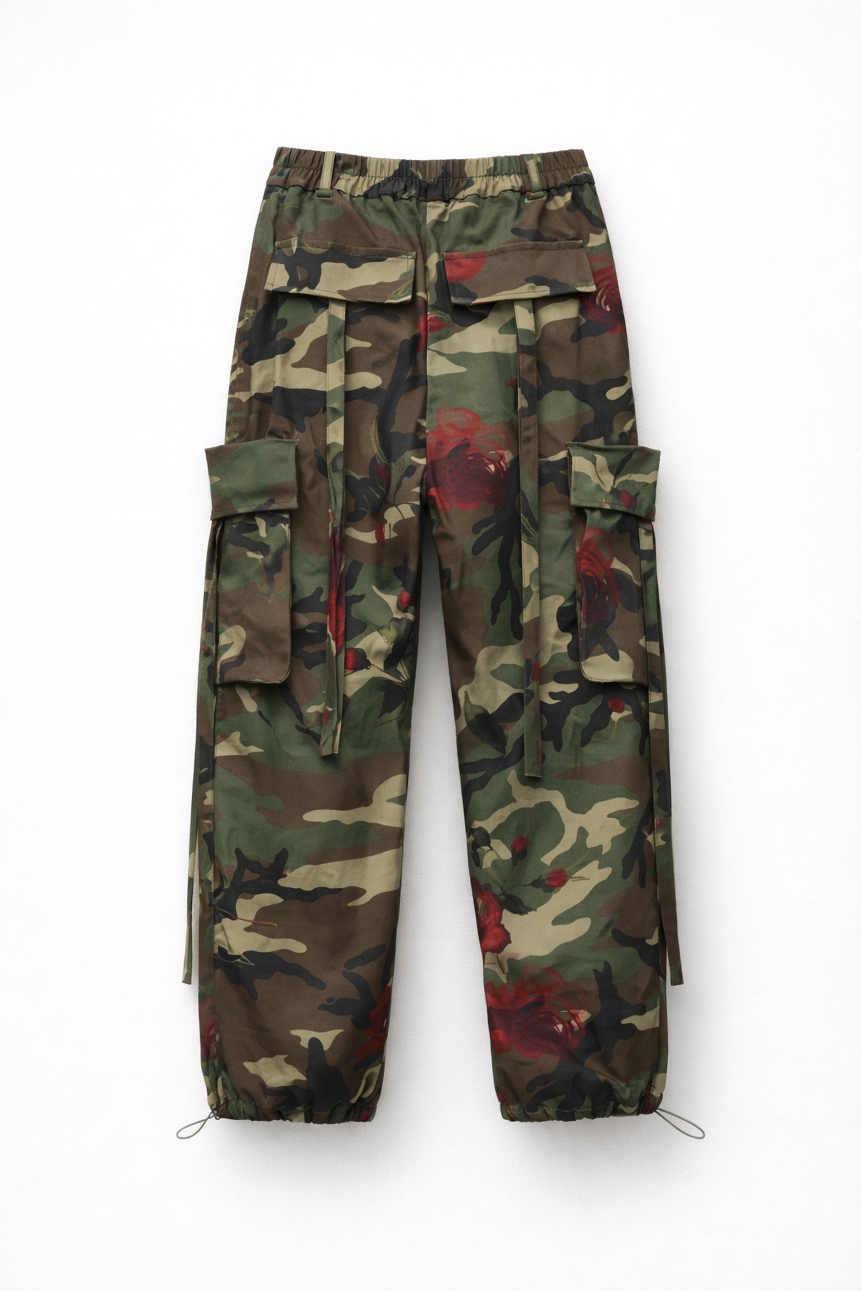 Pantaloni cargo con stampa camouflage floreale. Vita alta con passanti. Fascia posteriore elasticizzata. Tasche laterali inserite. Tasche cargo laterali applicate con patta e nastri decorativi e regolabili. Tasche posteriori con patta. Fondo gamba con coulisse e stopper regolabile. Chiusura frontale con cerniera e bottone. Vestibilità regolare, disponibile in taglia S/M, M/L.