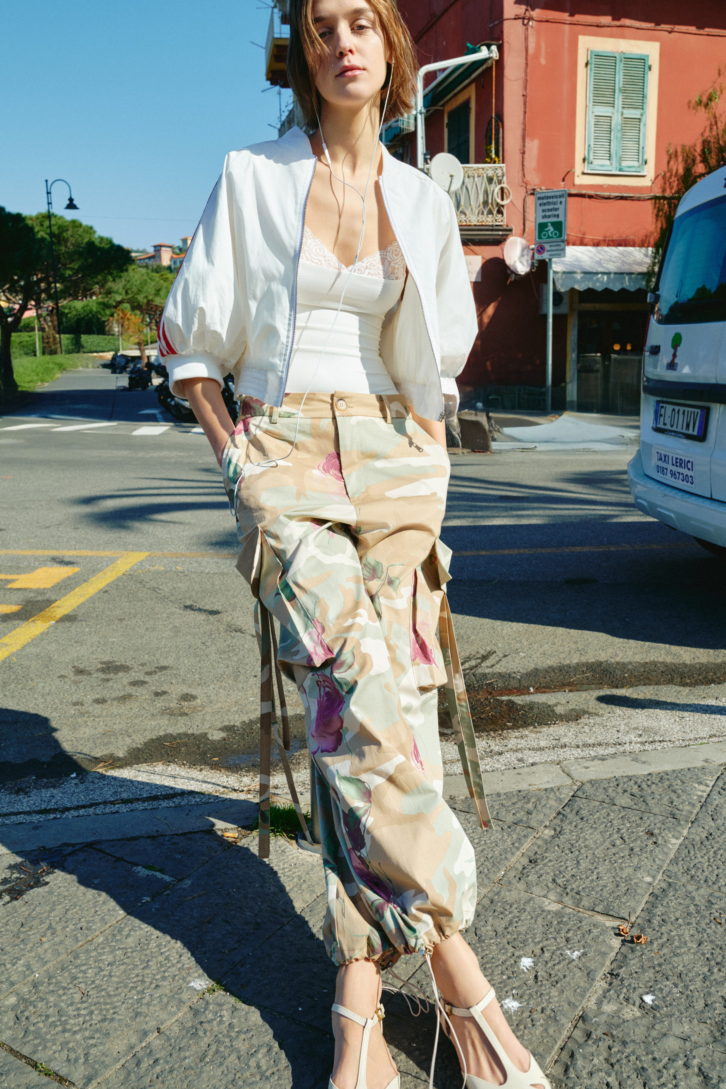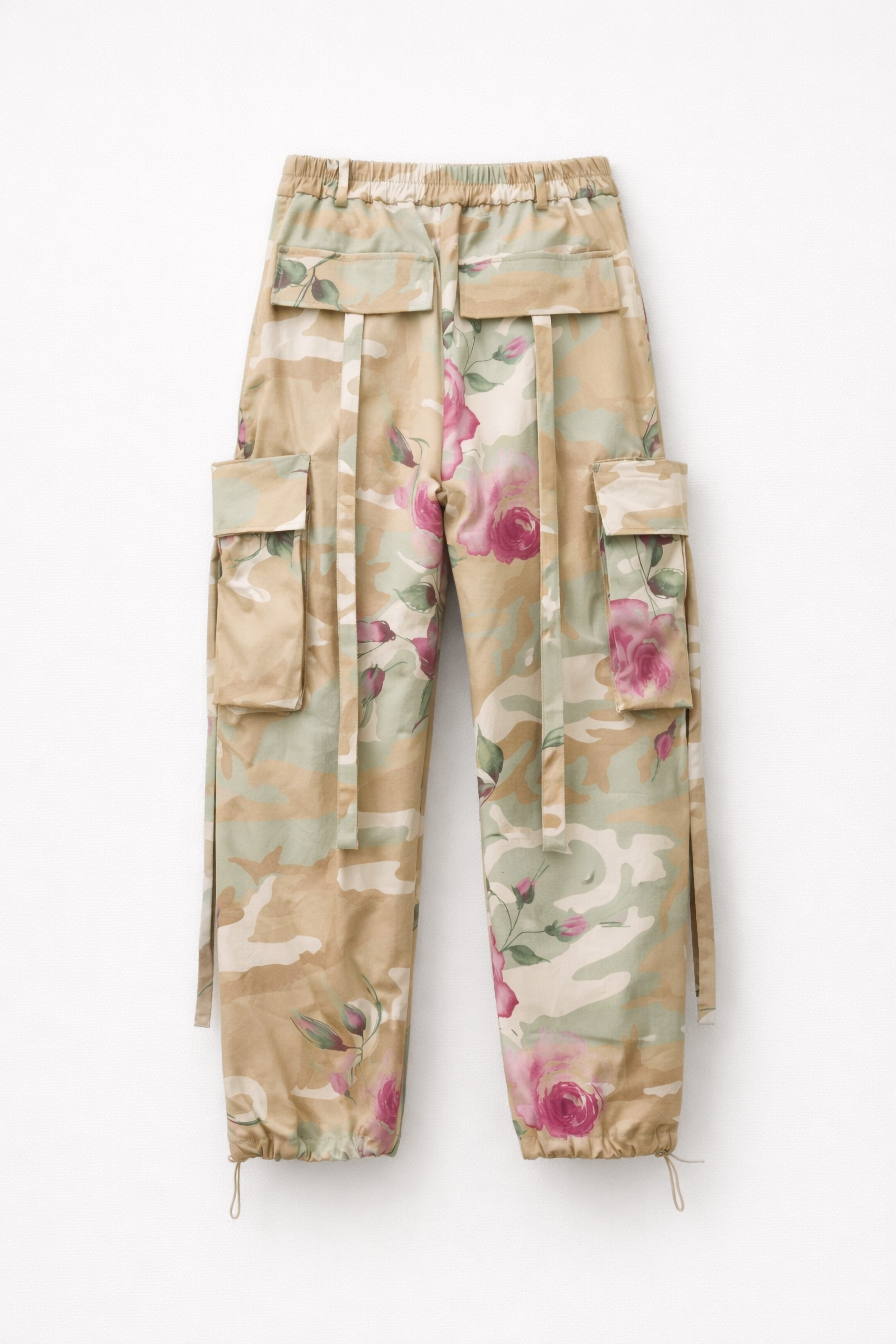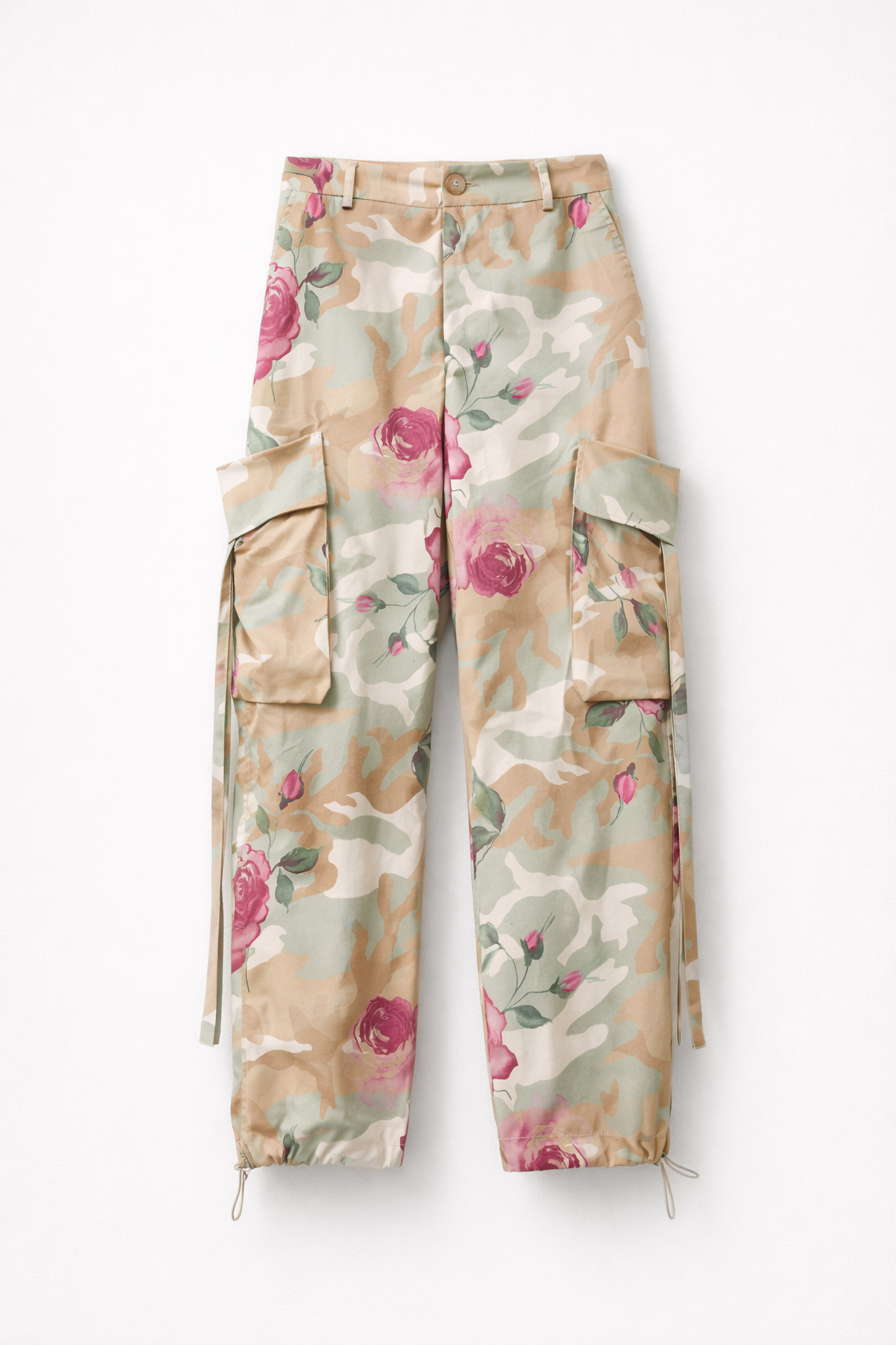 Pantaloni cargo con stampa camouflage floreale. Vita alta con passanti. Fascia posteriore elasticizzata. Tasche laterali inserite. Tasche cargo laterali applicate con patta e nastri decorativi e regolabili. Tasche posteriori con patta. Fondo gamba con coulisse e stopper regolabile. Chiusura frontale con cerniera e bottone. Vestibilità regolare, disponibile in taglia S/M, M/L.