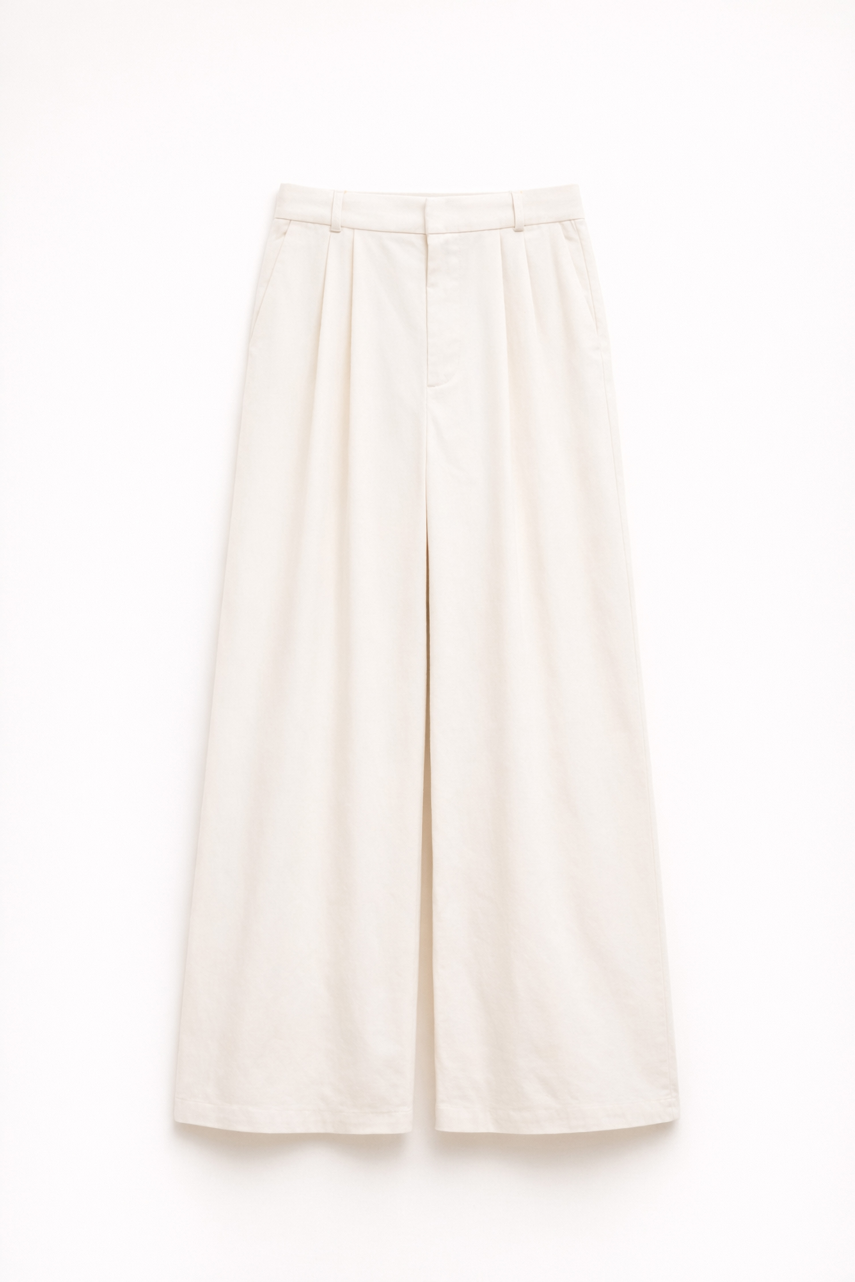 Pantaloni wide-leg in misto tencel. Vita alta strutturata. Pinces frontali. Tasche laterali inserite funzionali. Chiusura frontale con cerniera e bottone. Vestibilità regolare, disponibile in taglia S, M, L.