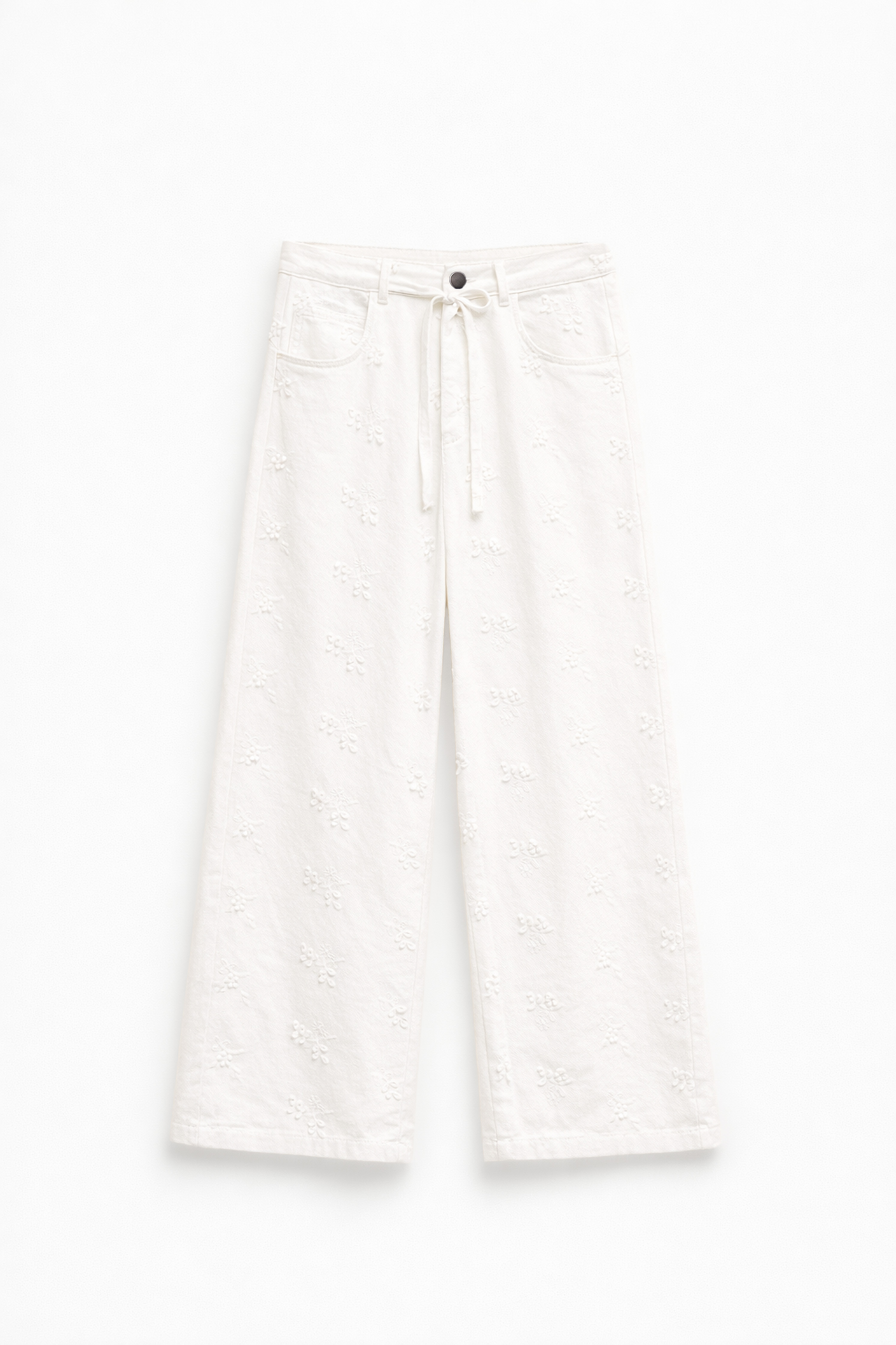 Pantaloni in cotone con ricami floreali in rilievo. Vita regolare con passanti per cintura. Tasche frontali e tasche posteriori applicate. Chiusura frontale con cerniera e bottone. Vestibilità regolare, disponibile in taglia S, M, L.