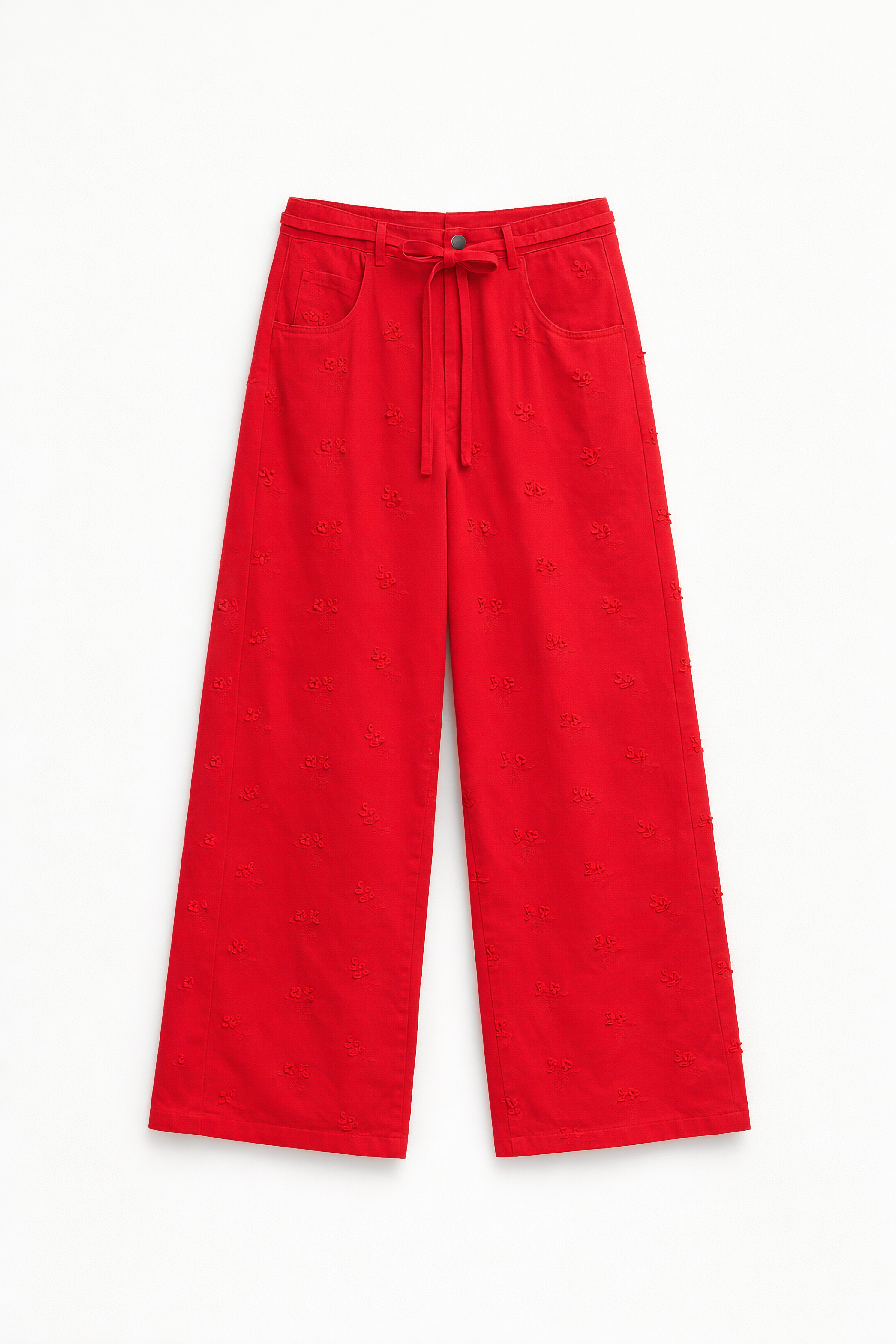 Pantaloni in cotone con ricami floreali in rilievo. Vita regolare con passanti per cintura. Tasche frontali e tasche posteriori applicate. Chiusura frontale con cerniera e bottone. Vestibilità regolare, disponibile in taglia S, M, L.