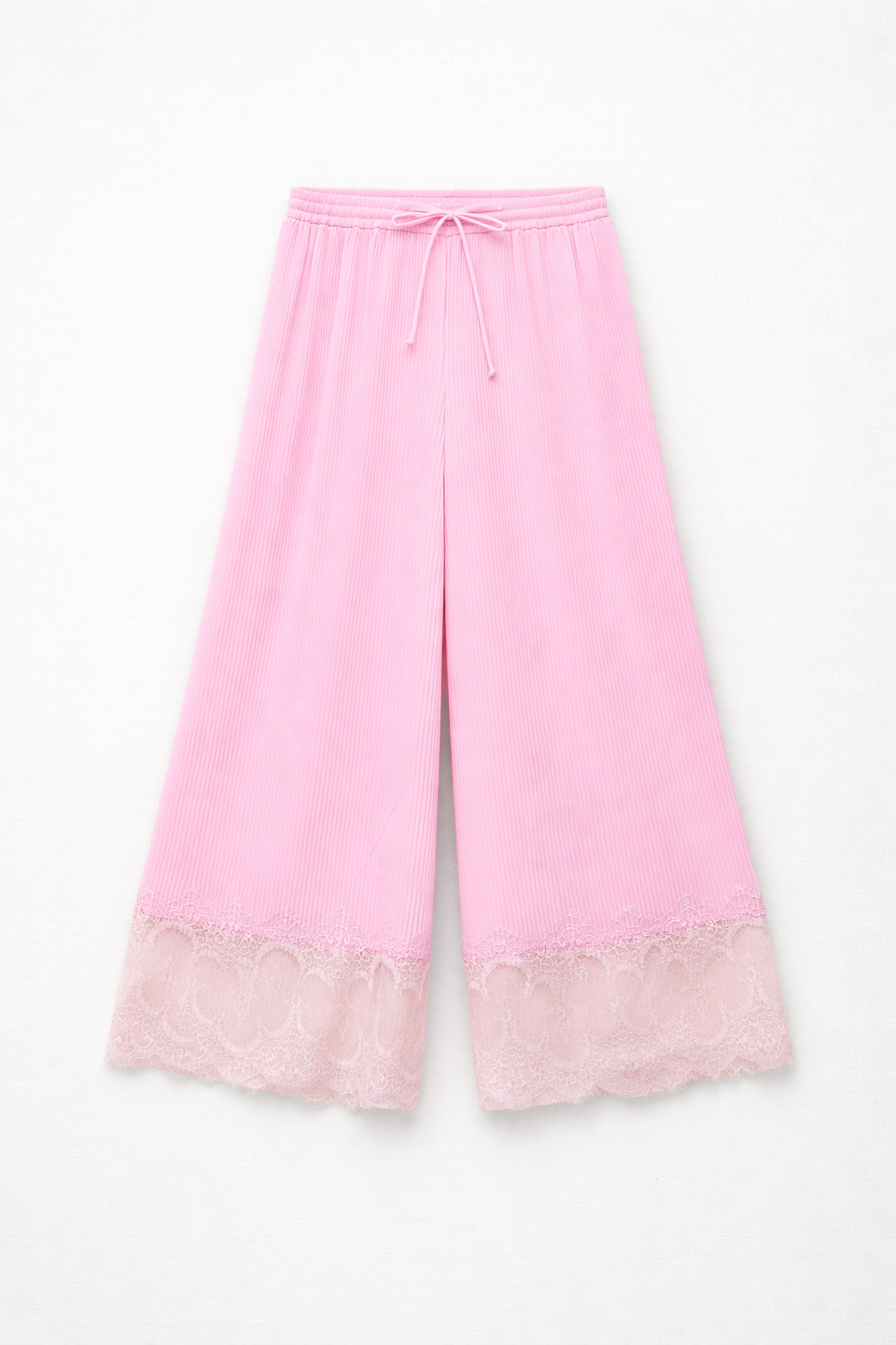 Pantaloni in tessuto plissettato misto cotone. Vita elasticizzata con coulisse regolabile. Inserto in pizzo floreale trasparente al fondo. Vestibilità regolare, disponibile in taglia S/M, M/L.