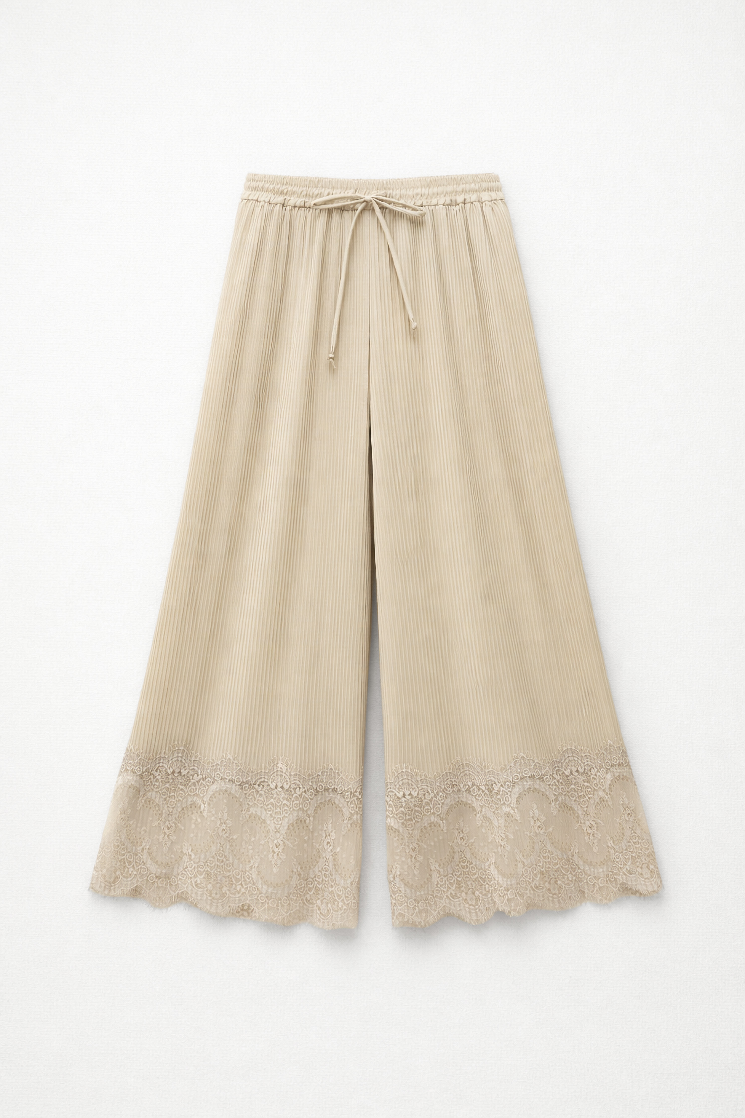 Pantaloni in tessuto plissettato misto cotone. Vita elasticizzata con coulisse regolabile. Inserto in pizzo floreale trasparente al fondo. Vestibilità regolare, disponibile in taglia S/M, M/L.