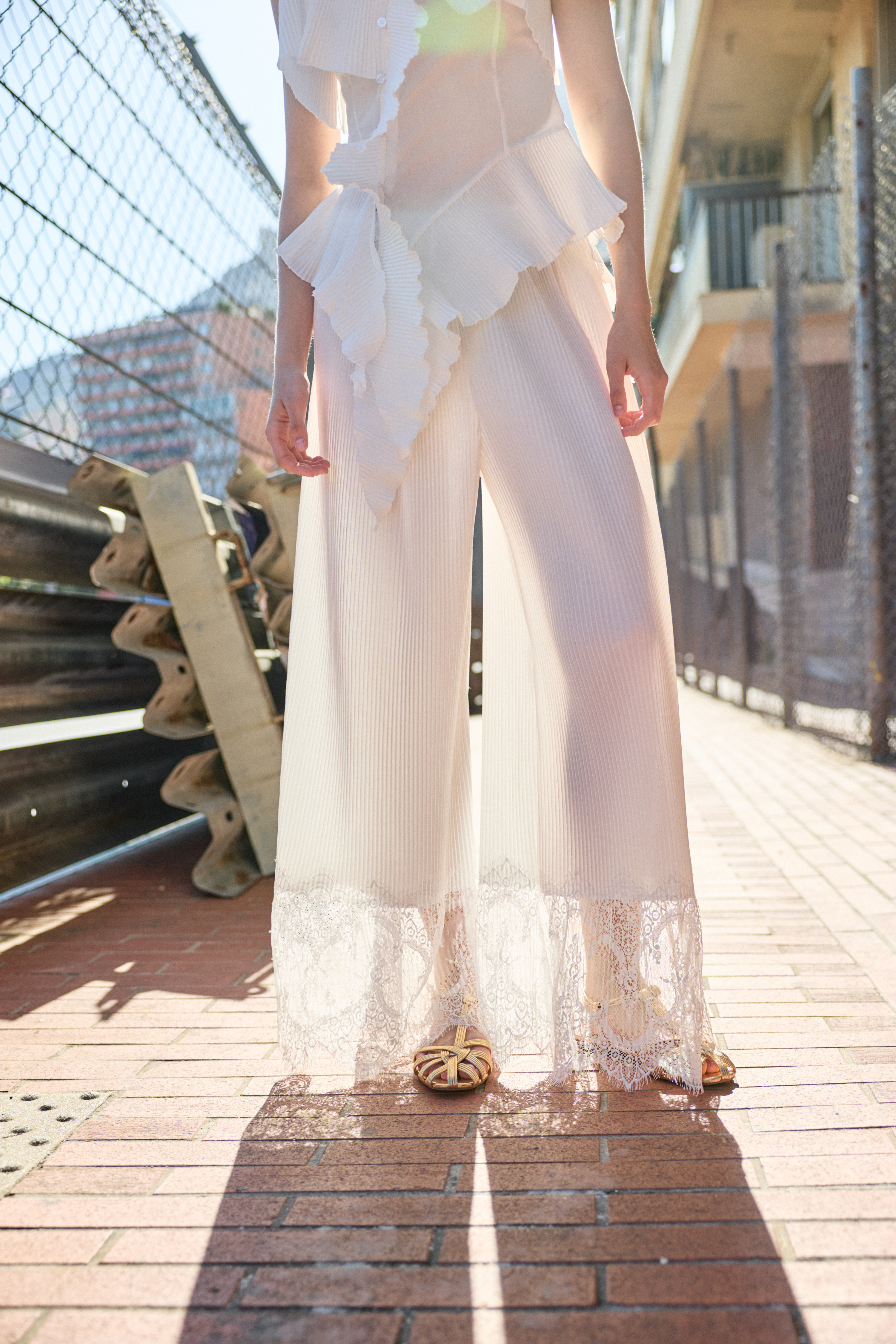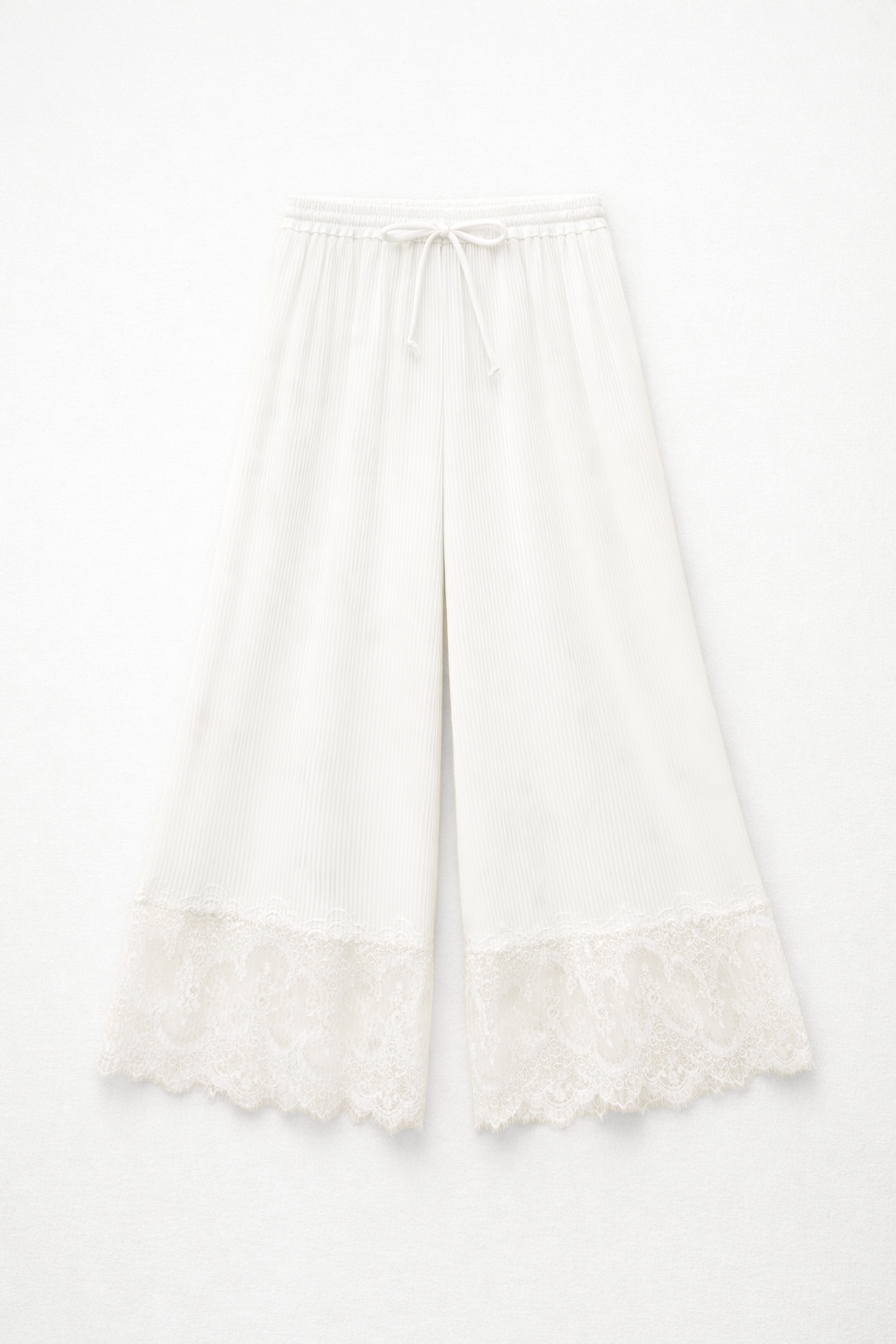 Pantaloni in tessuto plissettato misto cotone. Vita elasticizzata con coulisse regolabile. Inserto in pizzo floreale trasparente al fondo. Vestibilità regolare, disponibile in taglia S/M, M/L.