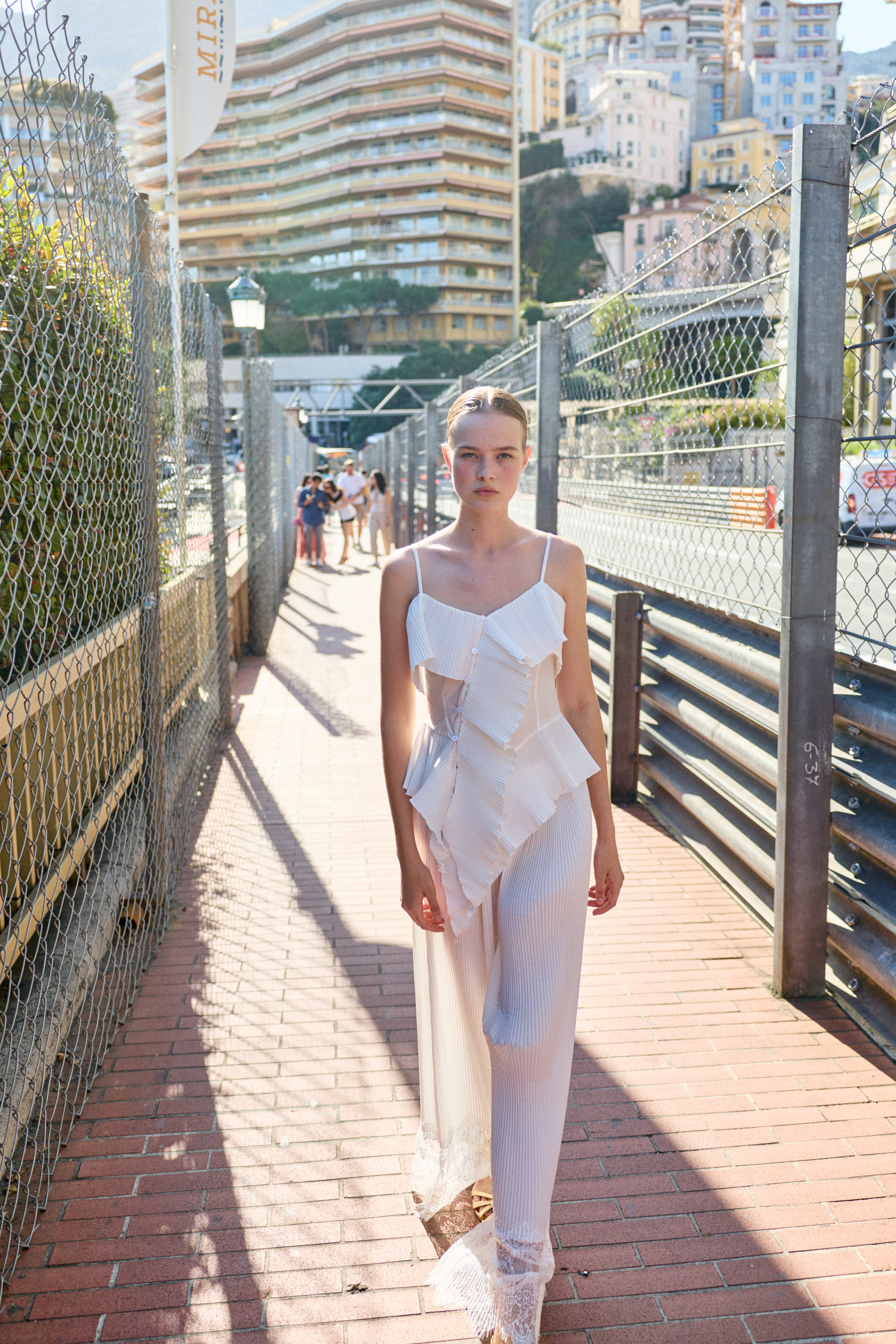Abito mino in tessuto plissettato misto cotone. Collo alto strutturato con volant plissettato. Senza maniche con spalle arricchiate da ruches plissettate. Gonna a balze con lavorazione plissé. Apertura frontale con lacci interni regolabili. Vestibilità regolare, disponibile in taglia S, M, L.
