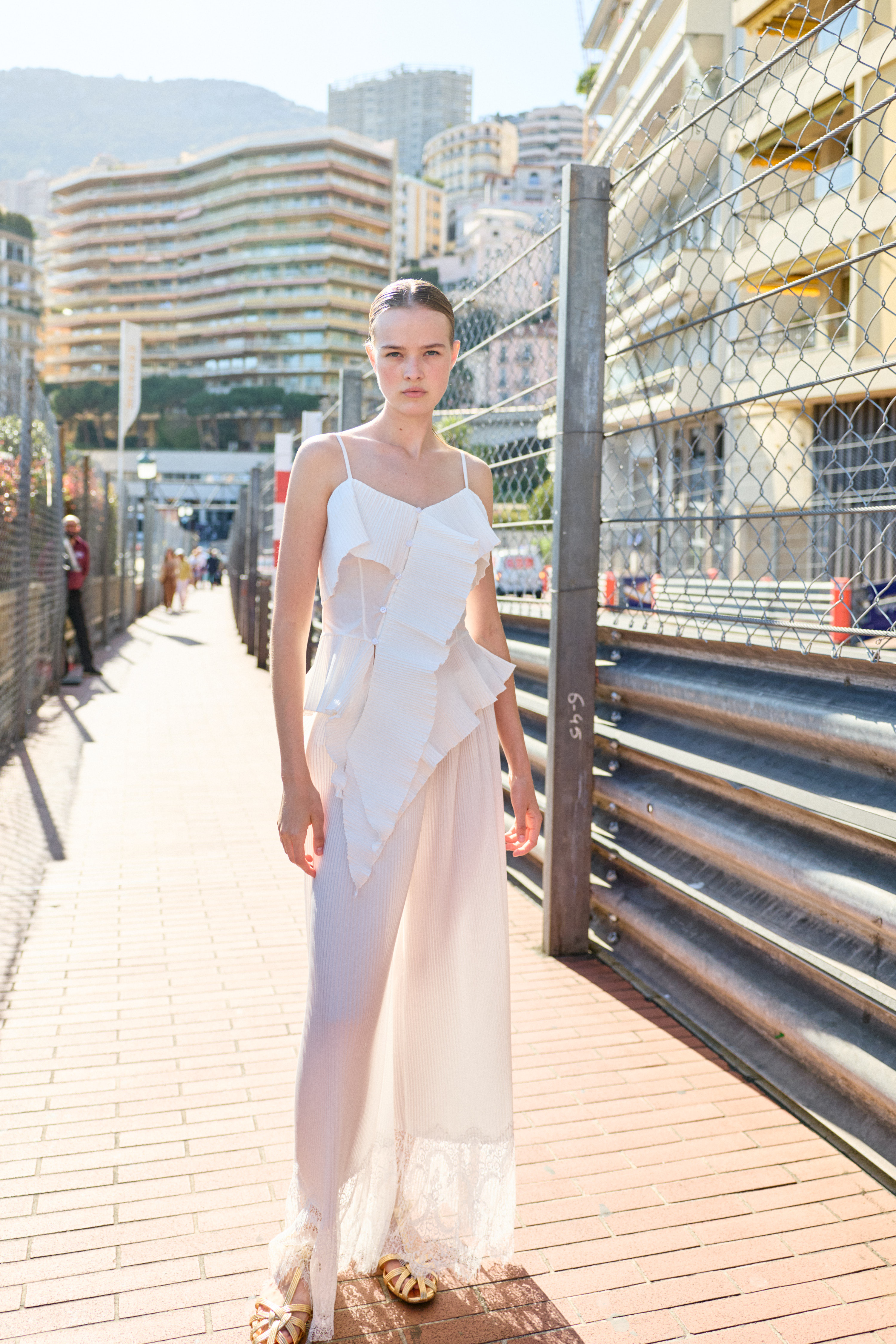 Tuta in tessuto plissettato misto cotone. Scollo con arricciatura. Spalline sottili regolabili. Balza sovrapposta sul top. Gamba ampia e fluida. Inserto in pizzo floreale trasparente al fondo. Vestibilità regolare, disponibile in taglia S/M, M/L.