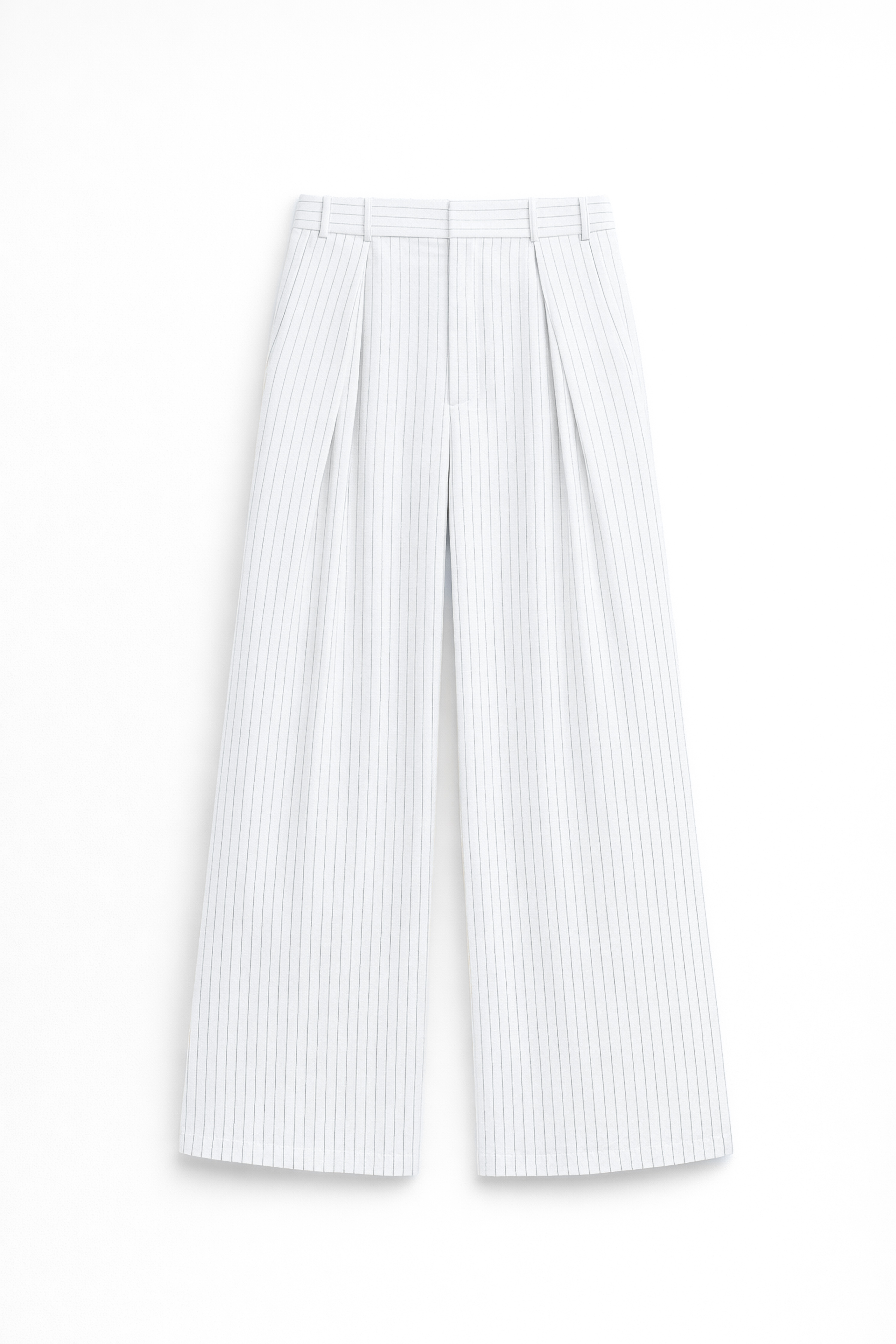 Pantaloni wide-leg con motivo a righe verticali. Vita alta con passanti per cintura. Pinces frontali. Tasche laterali inserite. Tasche posteriori con patta. Chiusura frontale con cerniera e bottone. Vestibilità regolare, disponibile in taglia S, M, L.