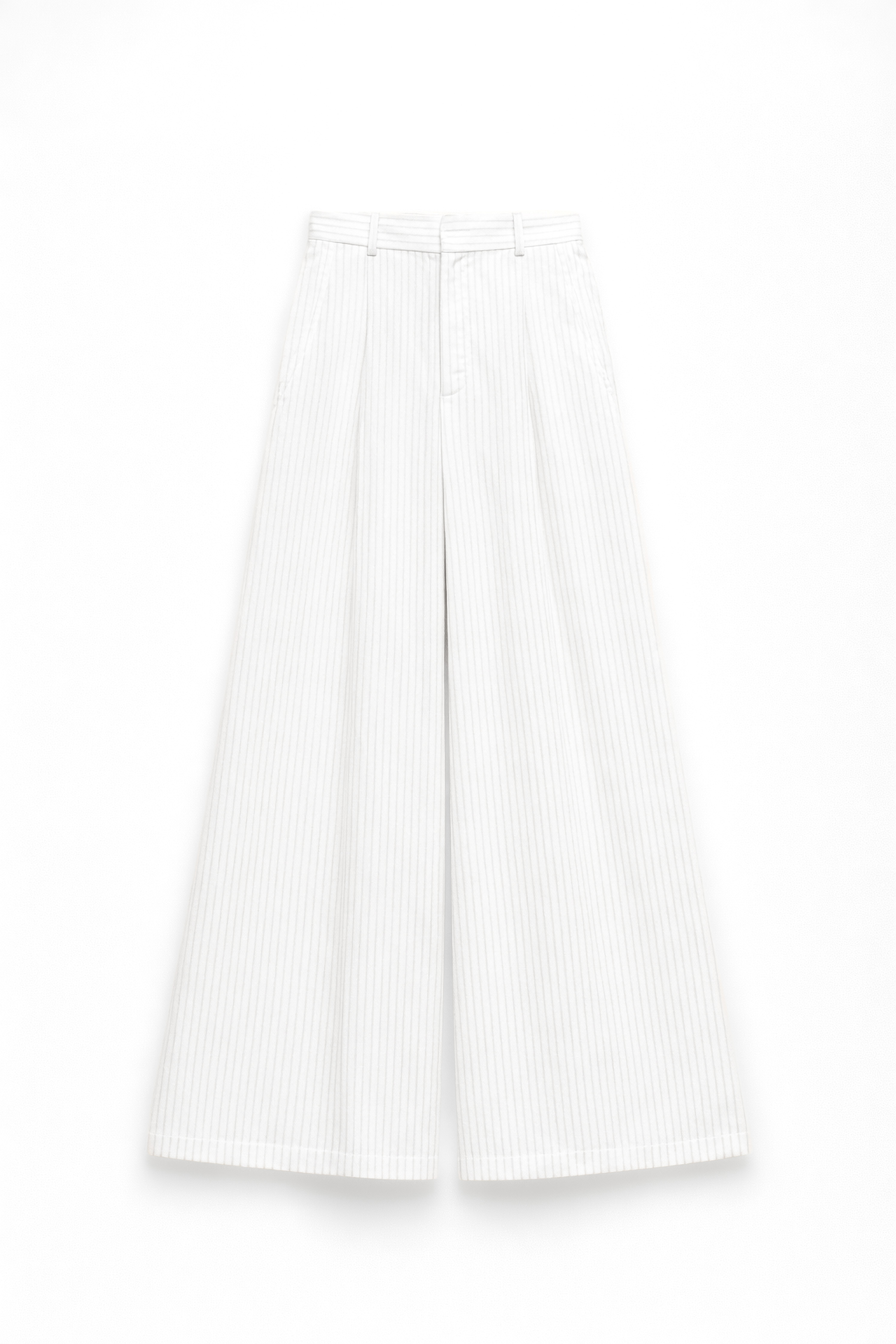 Pantaloni wide-leg con motivo a righe verticali. Vita alta con passanti per cintura. Pinces frontali. Tasche laterali inserite. Tasche posteriori con patta. Chiusura frontale con cerniera e bottone. Vestibilità regolare, disponibile in taglia S, M, L.