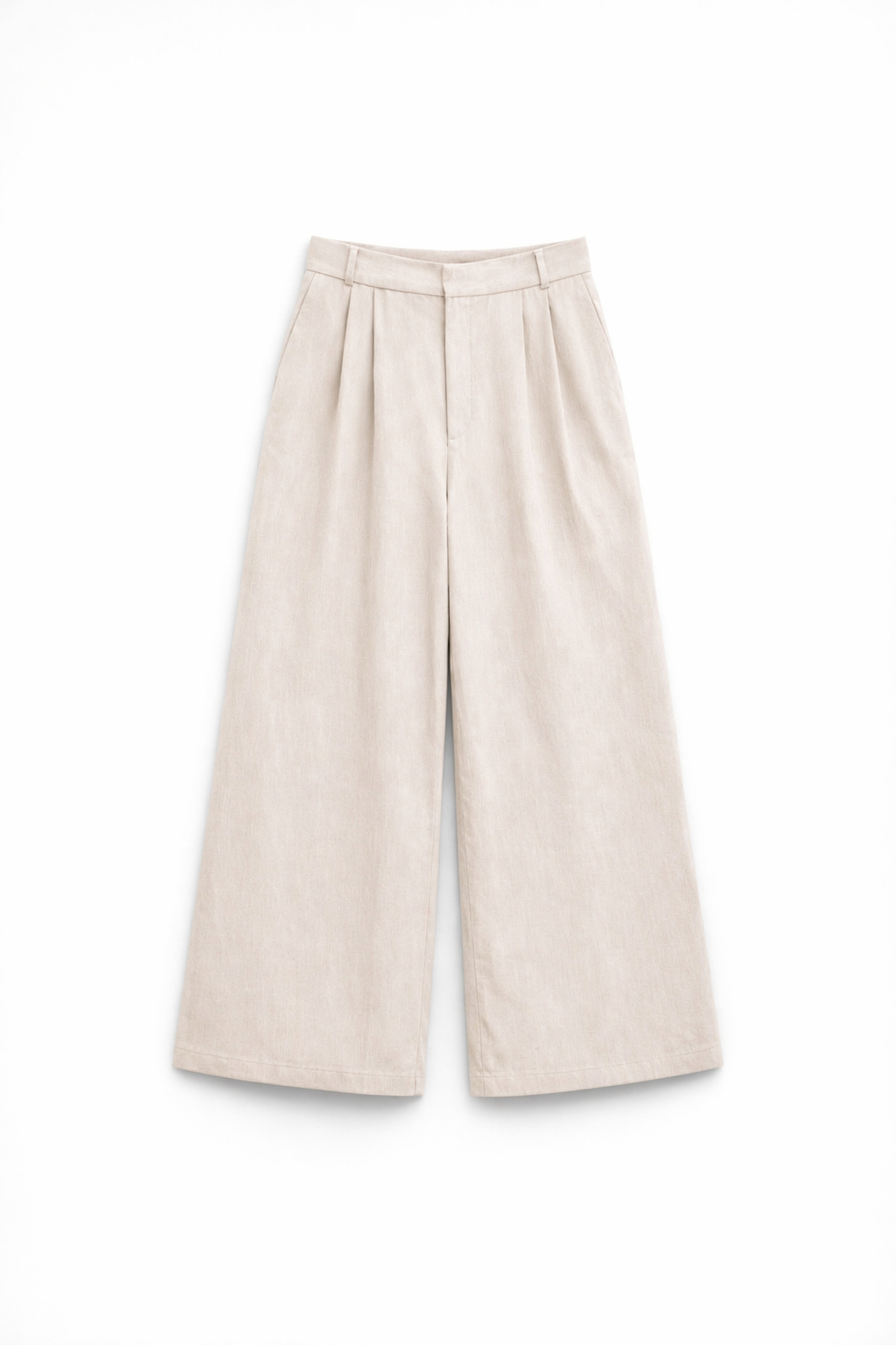 Pantaloni palazzo in tessuto misto lino. Vita alta strutturata con passanti per cintura. Tasche laterali inserite. Tasche posteriori a filetto con patta. Chiusura frontale con cerniera, gancio e bottone. Vestibilità regolare, disponibile in taglia S, M, L.