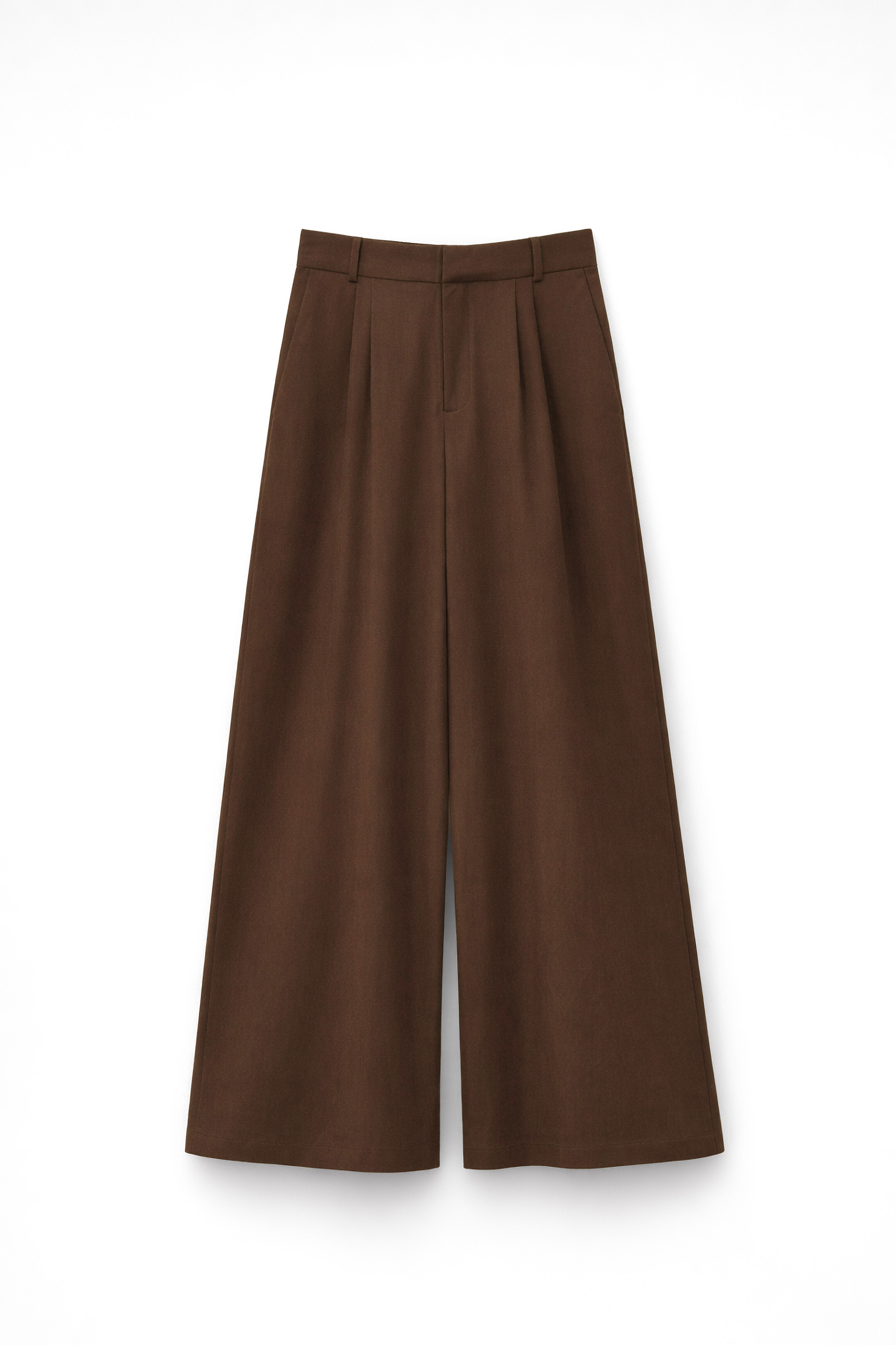 Pantaloni wide-leg vita alta con passanti. Presenta pinces frontali profonde. Tasche laterali inserite nei fianchi. Chiusura frontale con cerniera e bottone. Vestibilità regolare, disponibile in taglia S, M, L.
