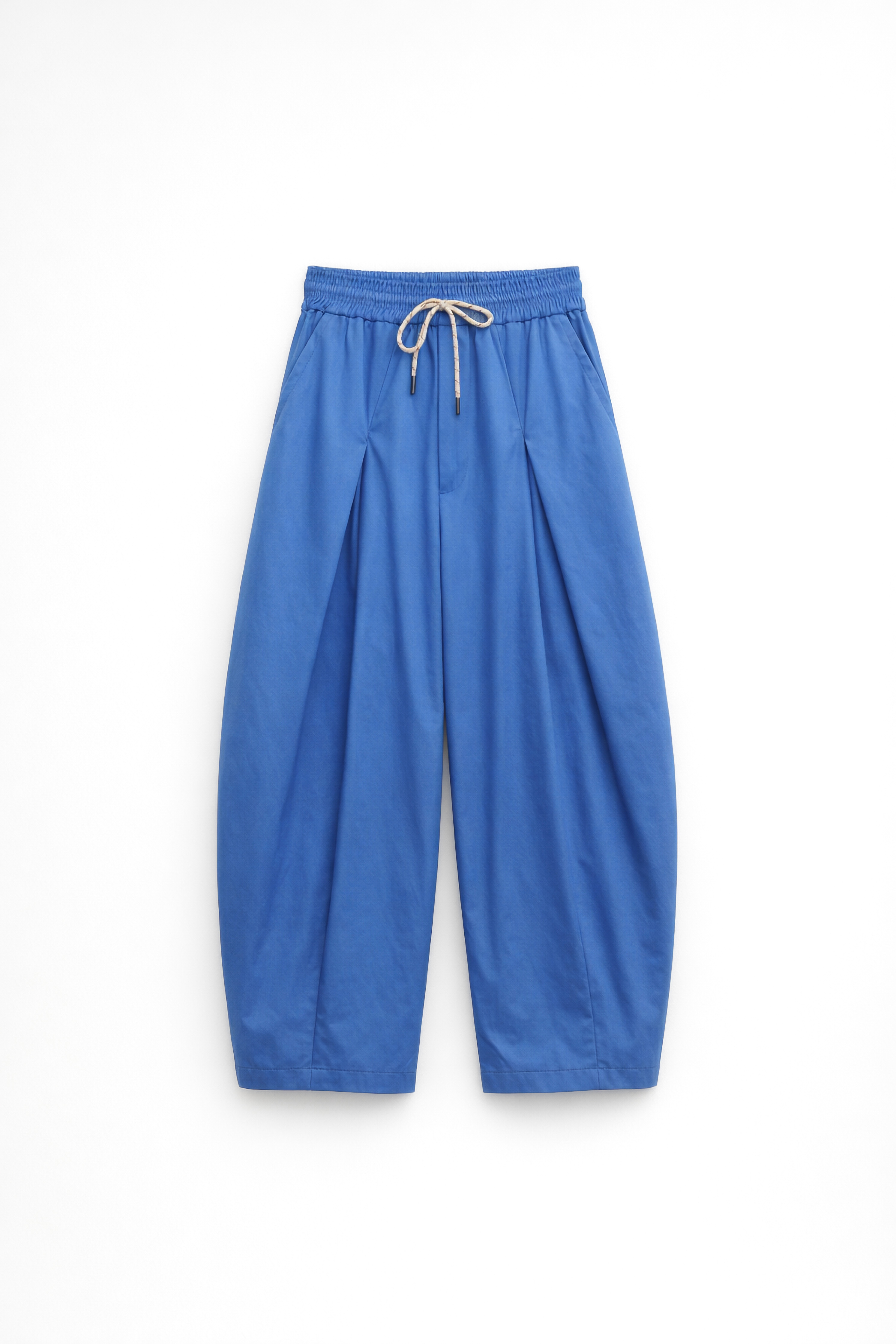 Pantaloni wide-leg in cotone elasticizzato. Vita alta elasticizzata con coulisse regolabile. Tasche laterali inserite. Presenta pinces frontali. Vestibilità regolare, disponibile in taglia S/M, M/L.