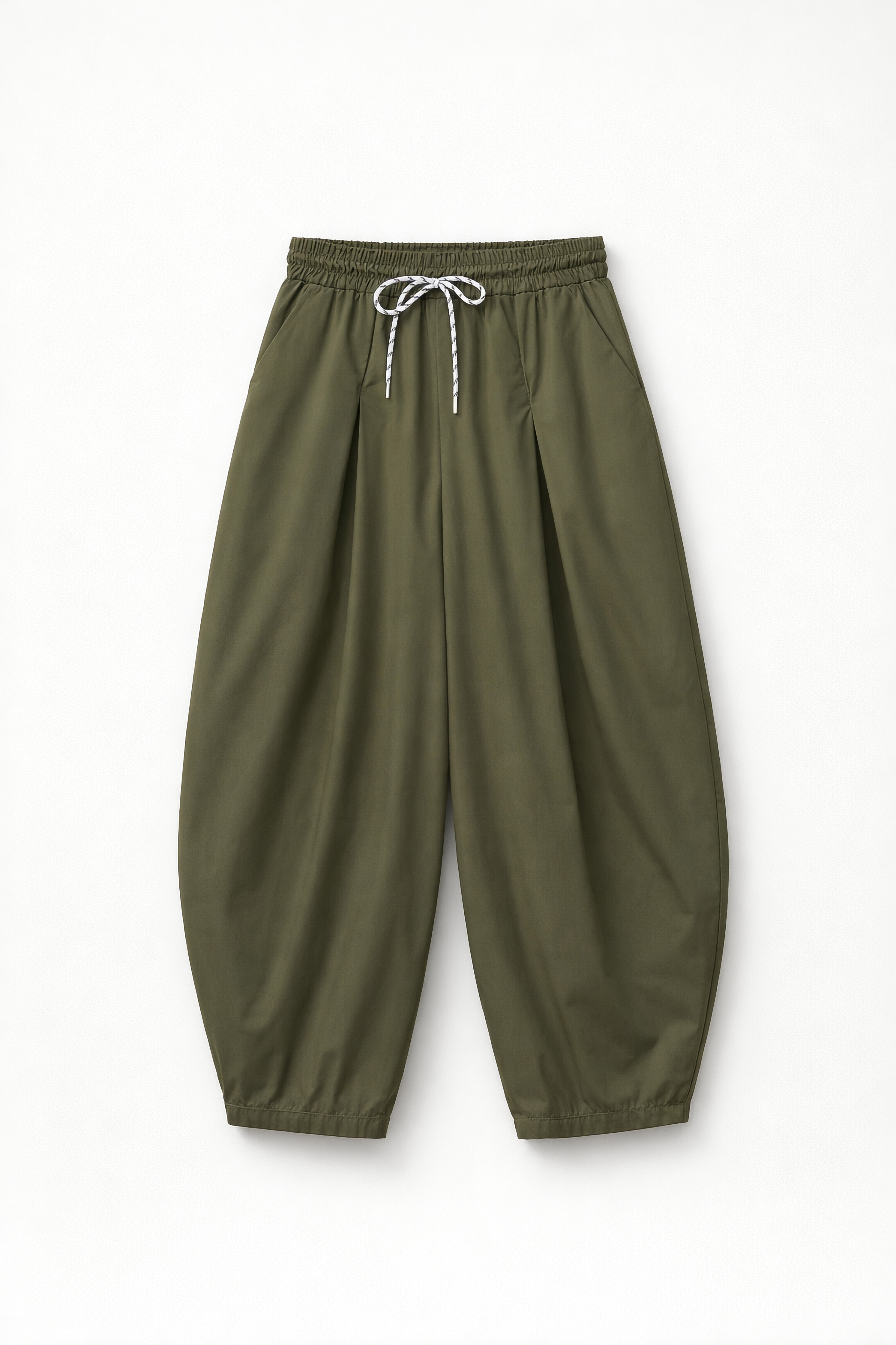 Pantaloni wide-leg in cotone elasticizzato. Vita alta elasticizzata con coulisse regolabile. Tasche laterali inserite. Presenta pinces frontali. Vestibilità regolare, disponibile in taglia S/M, M/L.