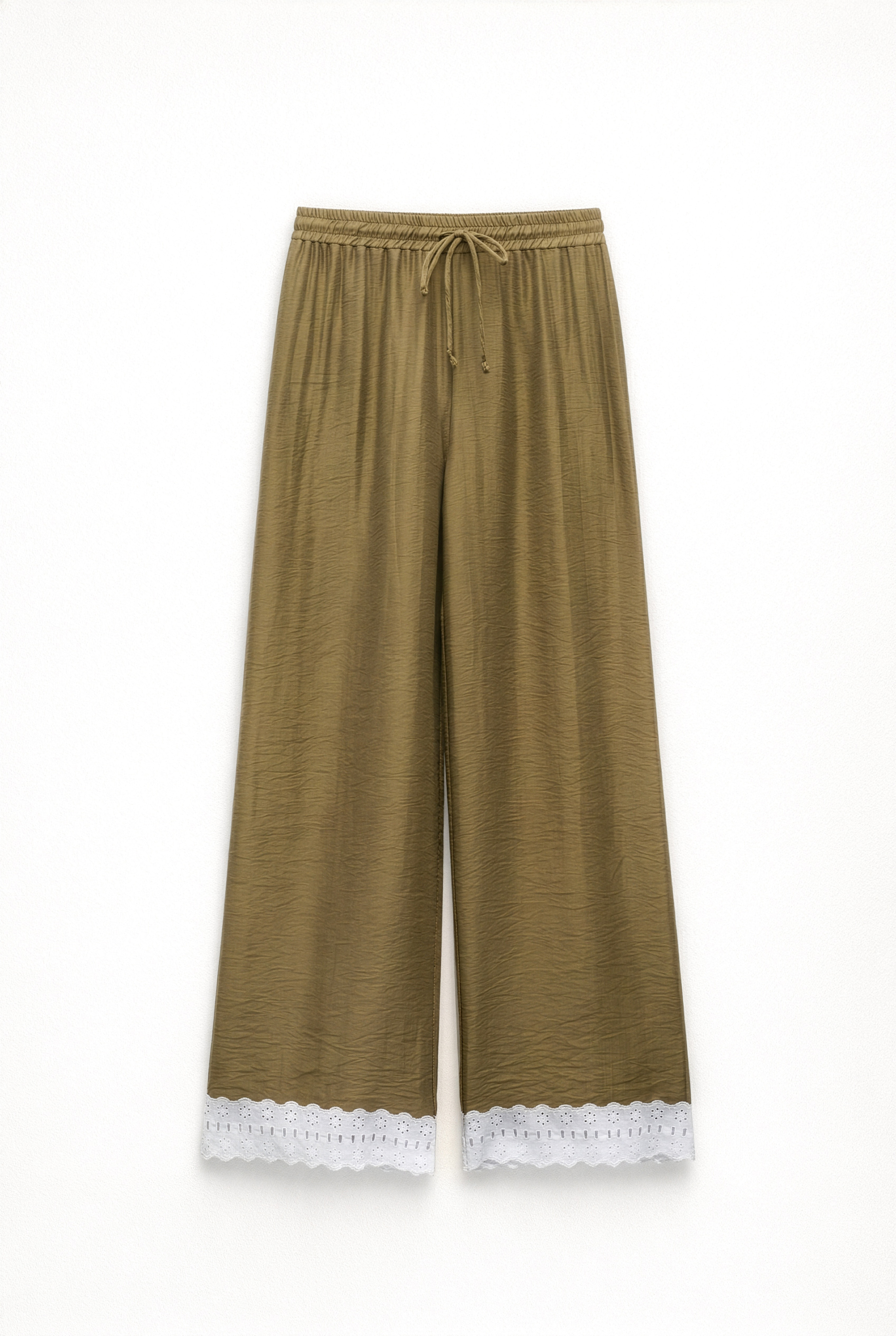 Pantaloni palazzo in tessuto misto lino. Vita con passanti per cintura e inserto in pizzo. Pieghe frontali. Tasche laterali funzionali. Tasca a filetto sul retro. Gamba ampia. Chiusura frontale con cerniera, gancio e bottone. Vestibilità regolare, disponibile in taglia S, M, L.