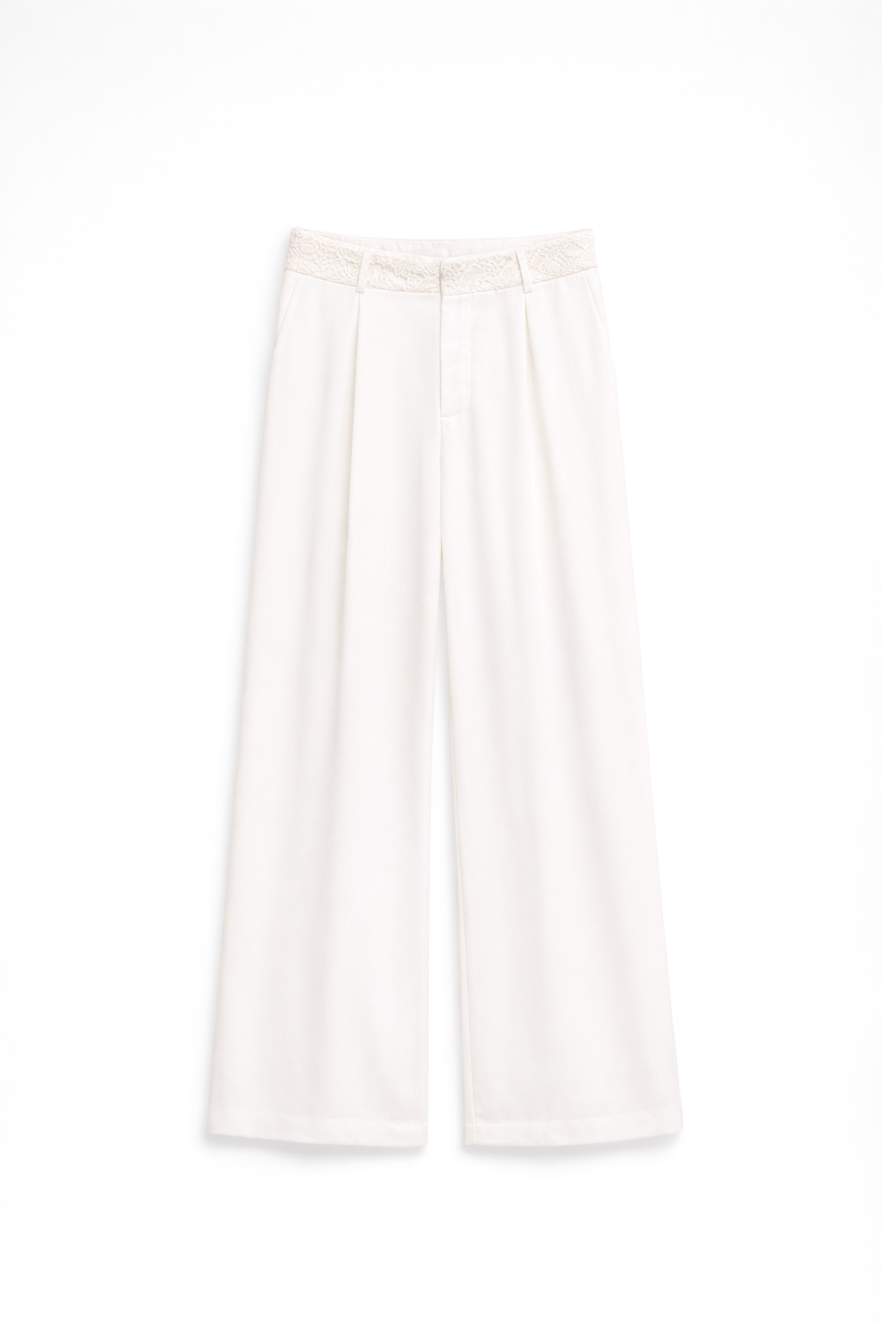 Pantaloni palazzo in tessuto misto lino. Vita con passanti per cintura e inserto in pizzo. Pieghe frontali. Tasche laterali funzionali. Tasca a filetto sul retro. Gamba ampia. Chiusura frontale con cerniera, gancio e bottone. Vestibilità regolare, disponibile in taglia S, M, L.