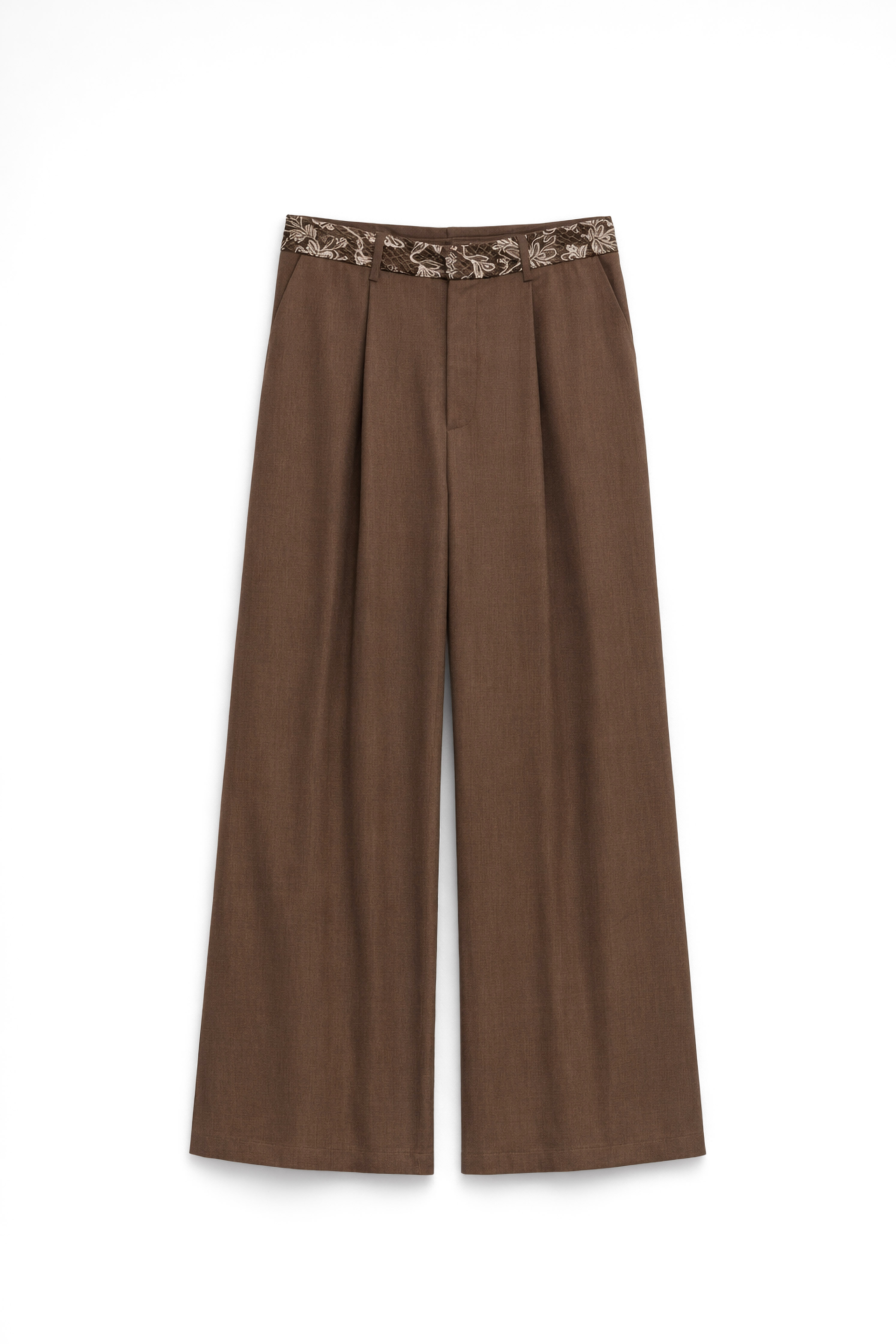 Pantaloni palazzo in tessuto misto lino. Vita con passanti per cintura e inserto in pizzo. Pieghe frontali. Tasche laterali funzionali. Tasca a filetto sul retro. Gamba ampia. Chiusura frontale con cerniera, gancio e bottone. Vestibilità regolare, disponibile in taglia S, M, L.