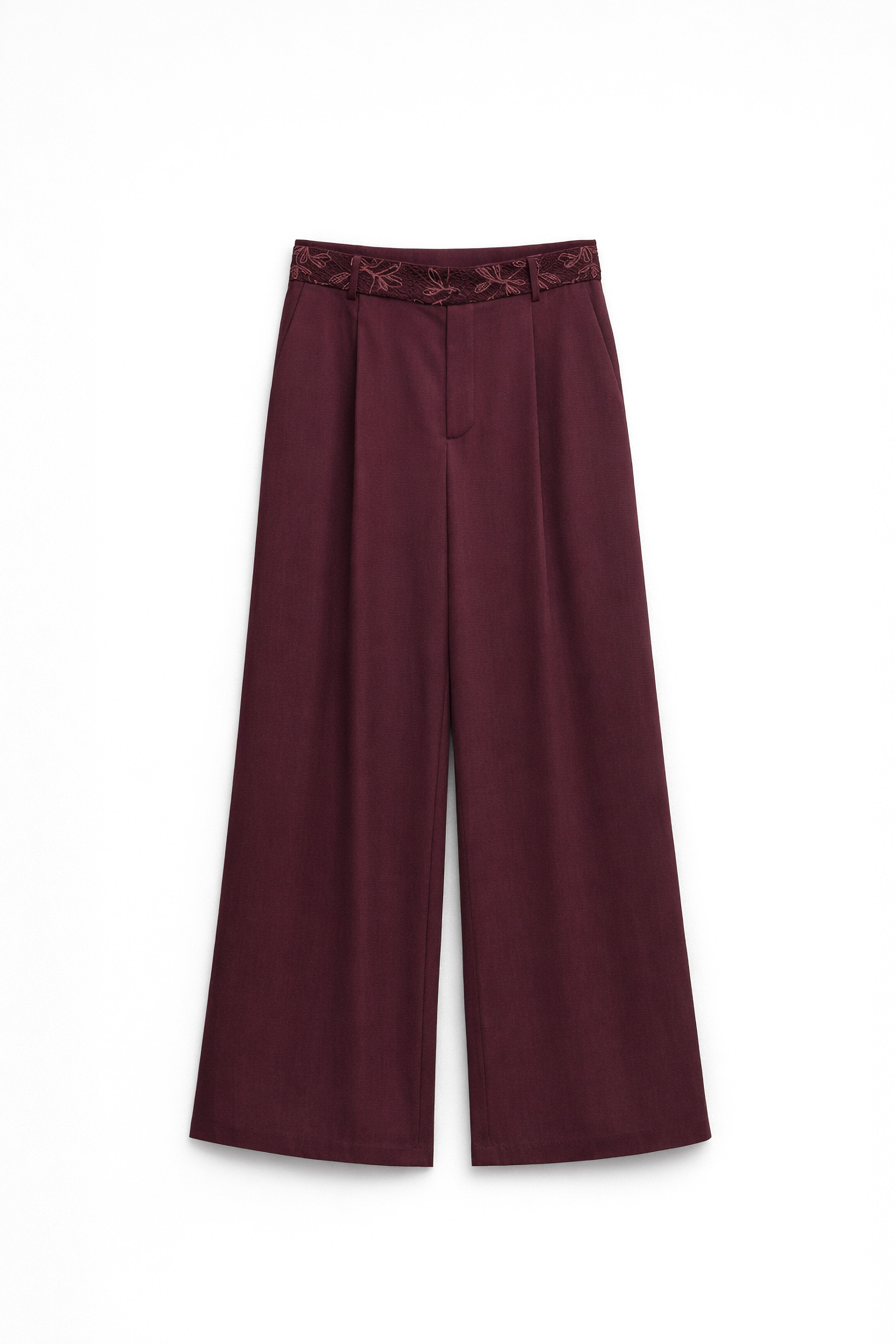 Pantaloni palazzo in tessuto misto lino. Vita con passanti per cintura e inserto in pizzo. Pieghe frontali. Tasche laterali funzionali. Tasca a filetto sul retro. Gamba ampia. Chiusura frontale con cerniera, gancio e bottone. Vestibilità regolare, disponibile in taglia S, M, L.
