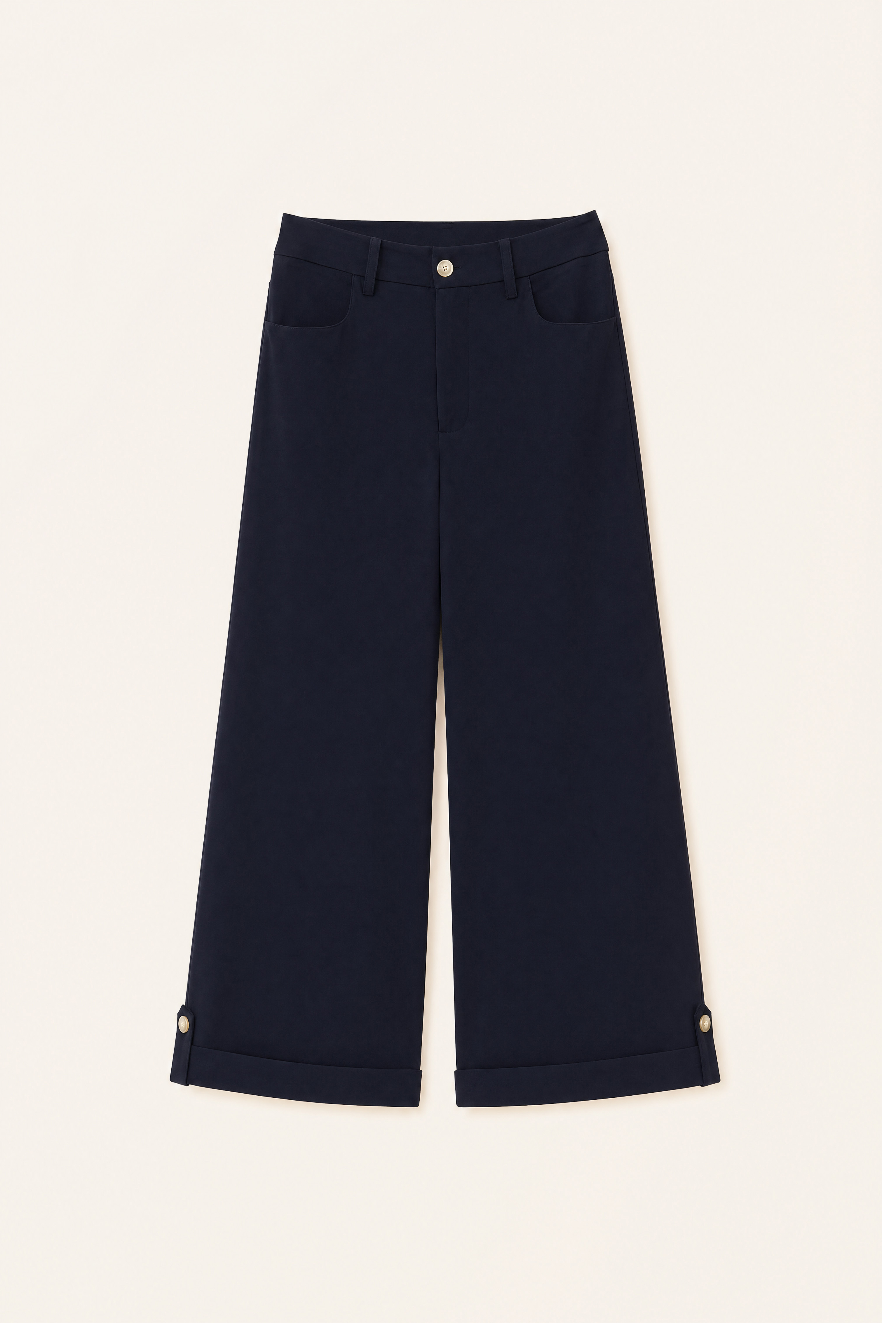 Vita alta con passanti per cintura. Pinces frontali.