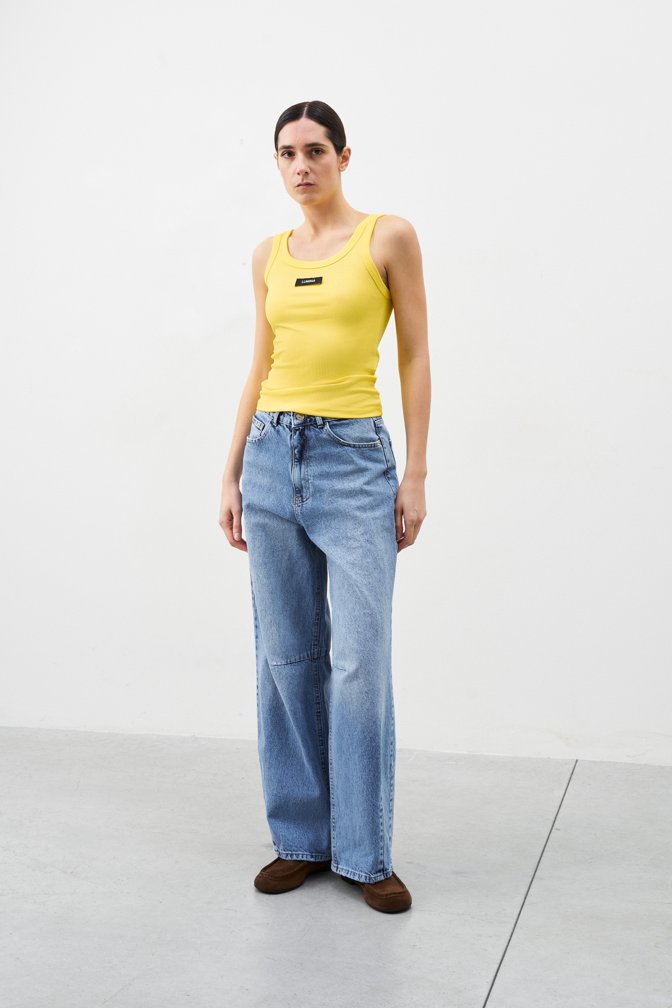 Top canotta a costine elasticizzata in misto seta. Scollo ampio, spalline larghe, fondo dritto rifiniti con inserti in pizzo. Chiusura frontale con bottoni con inserti in pizzo laterali. Vestibilità regolare, disponibile in taglia S/M, M/L.