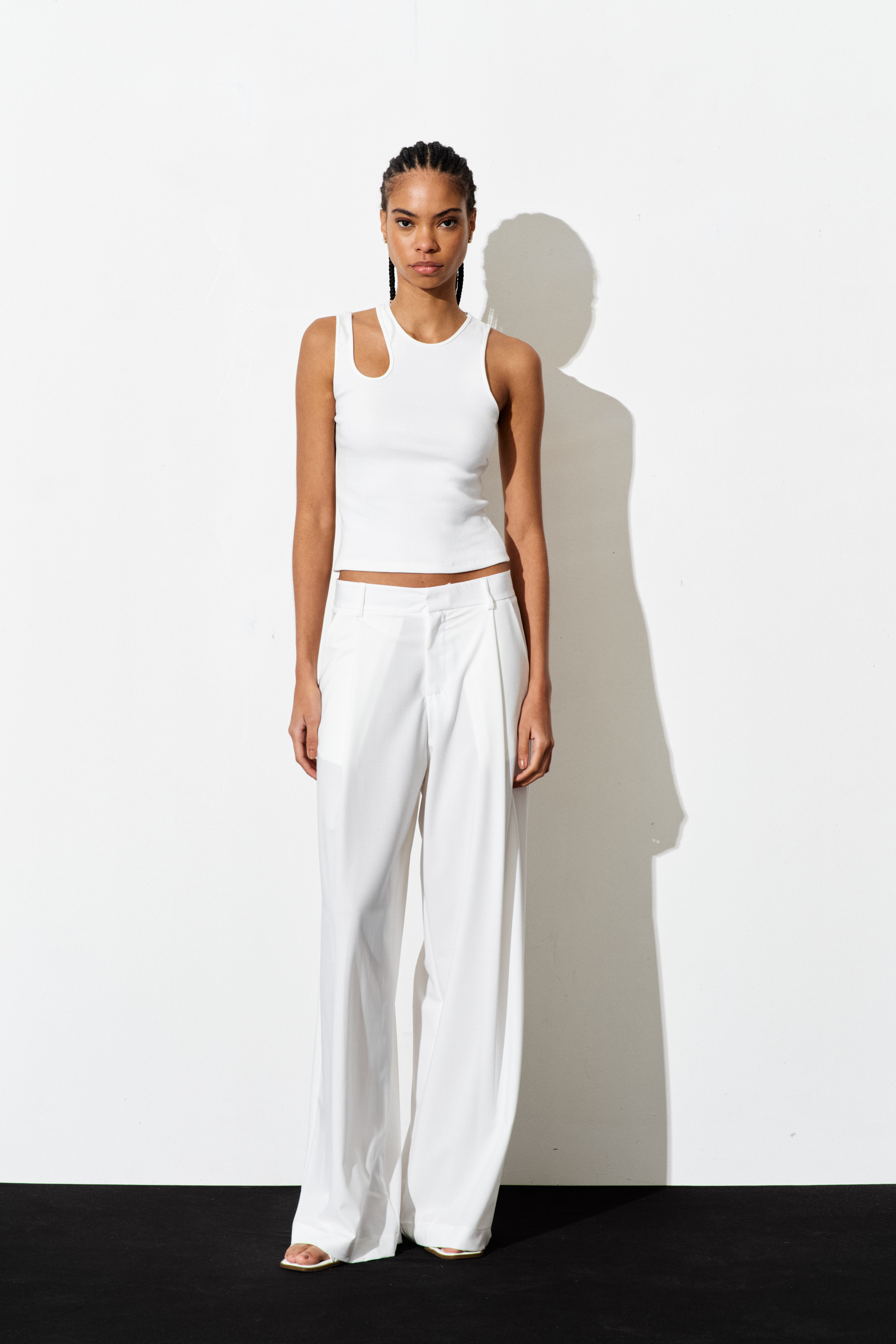 Top a costine con collo rotondo smanicato, dettaglio cut out.