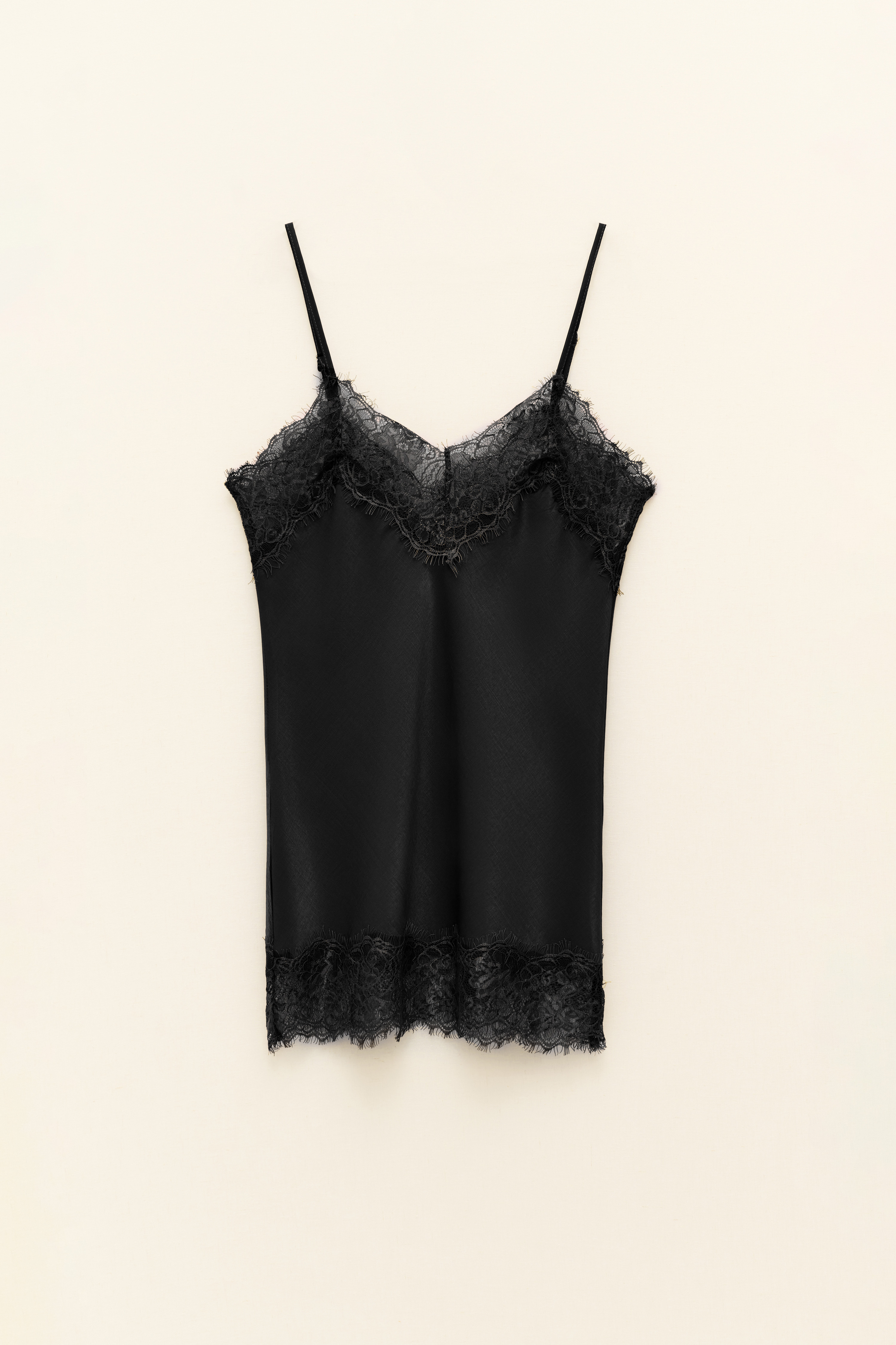 Scollo ampio, spalline larghe, fondo dritto rifiniti con inserti in pizzo.