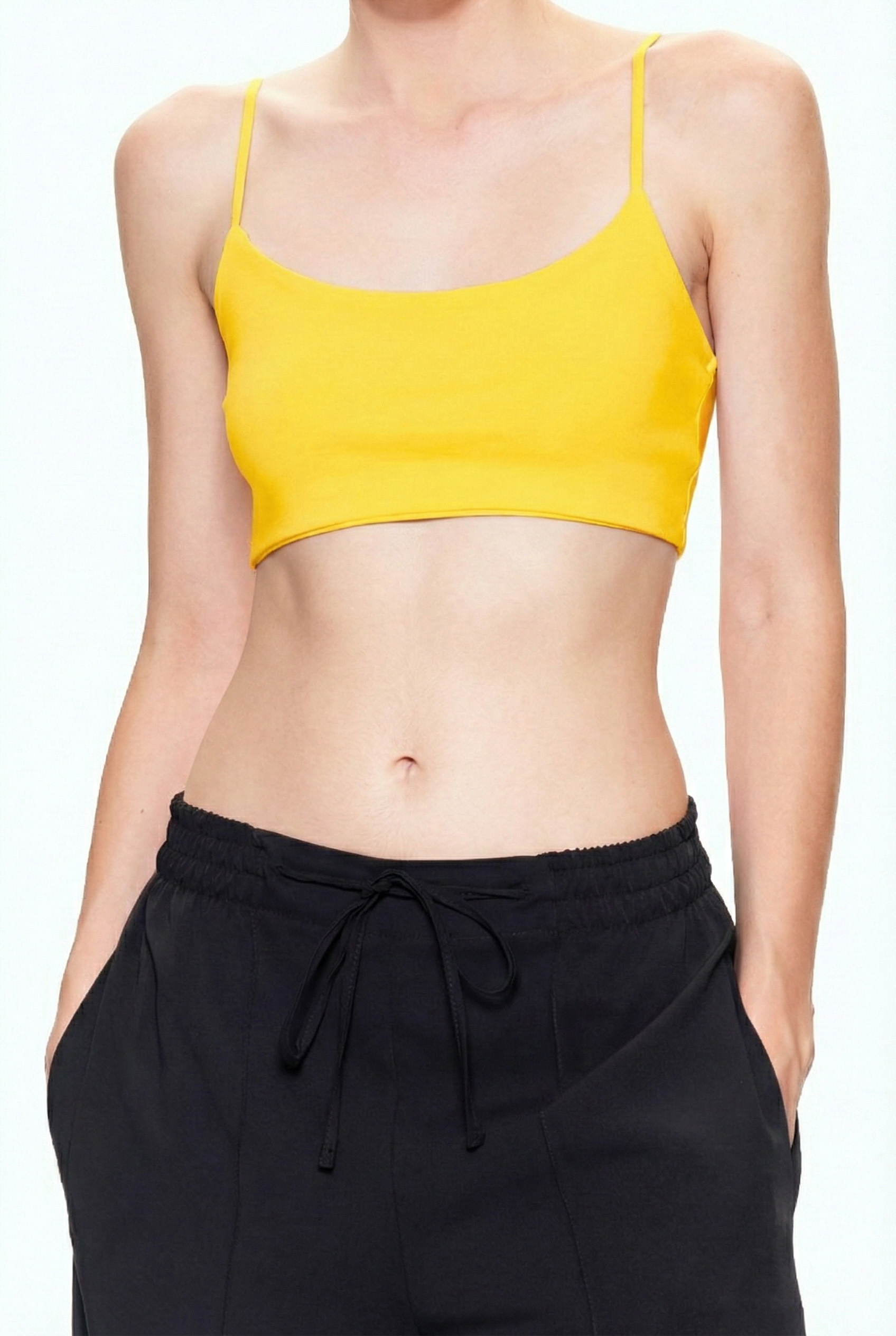 Canotta crop a costine con scollo ampio arrotondato. Coppe interne integrate per maggiore sostegno. Vestibilità regolare, disponibile in taglia S/M, M/L.