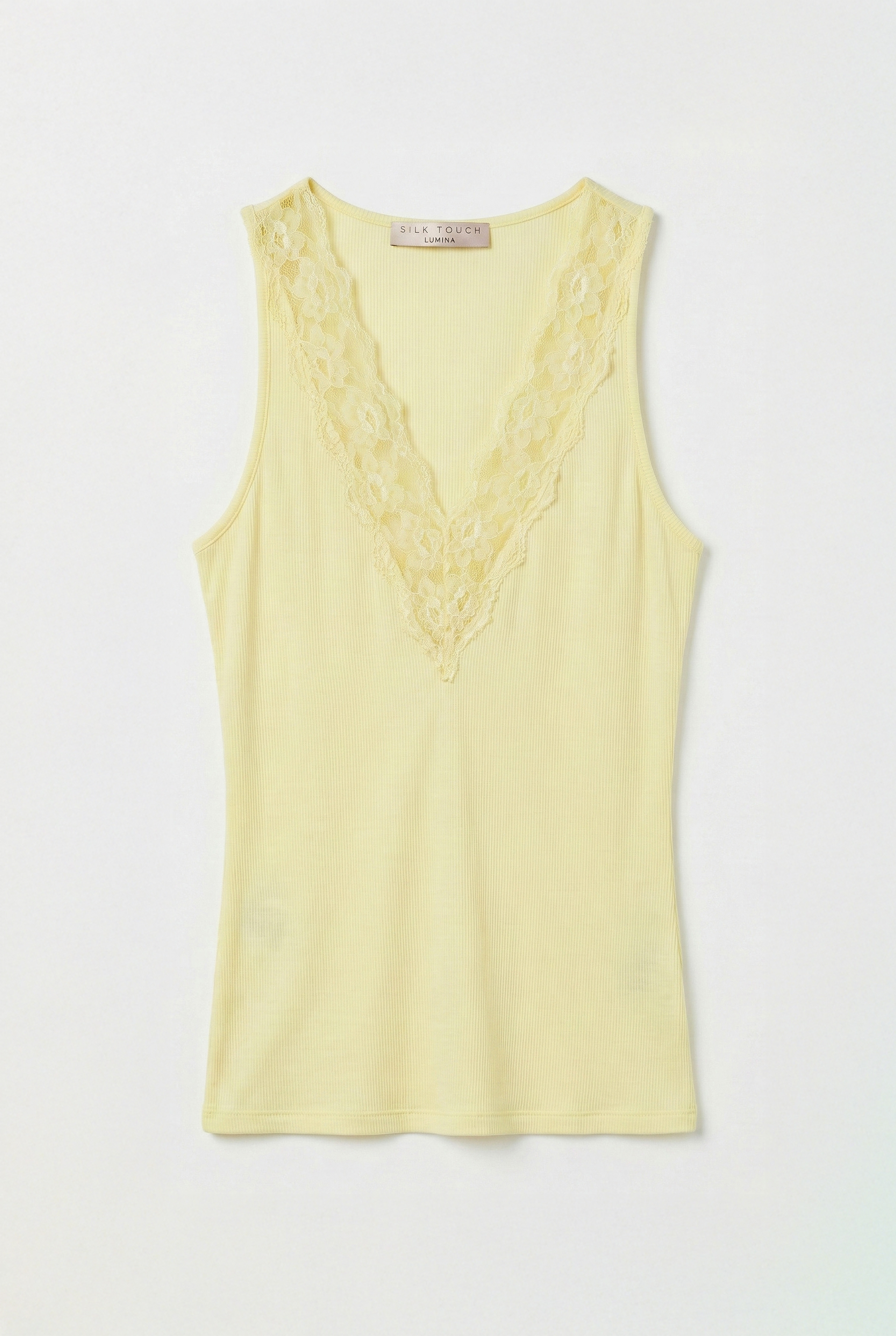 Scollo ampio, spalline larghe, fondo dritto rifiniti con inserti in pizzo.