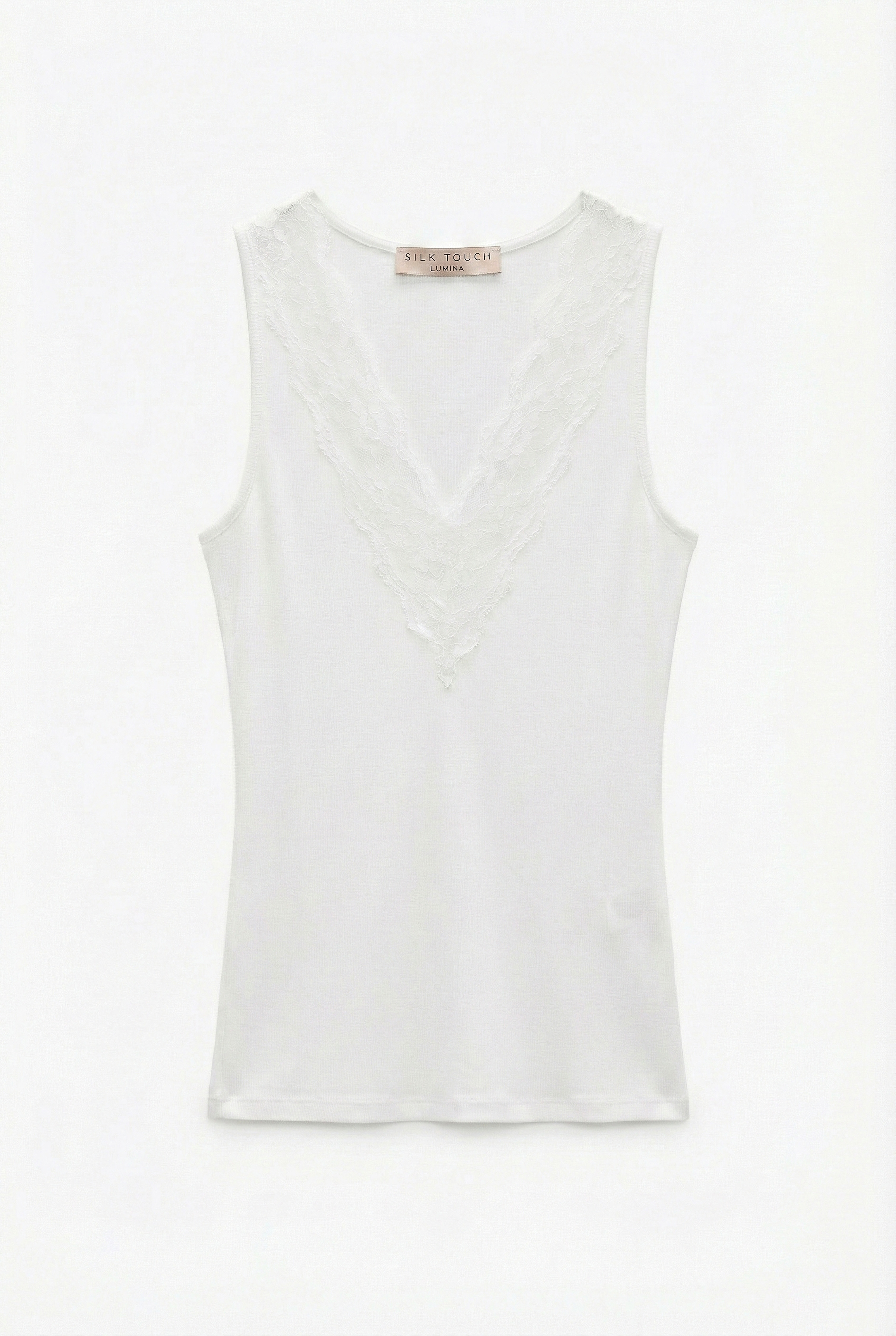 Scollo ampio, spalline larghe, fondo dritto rifiniti con inserti in pizzo.
