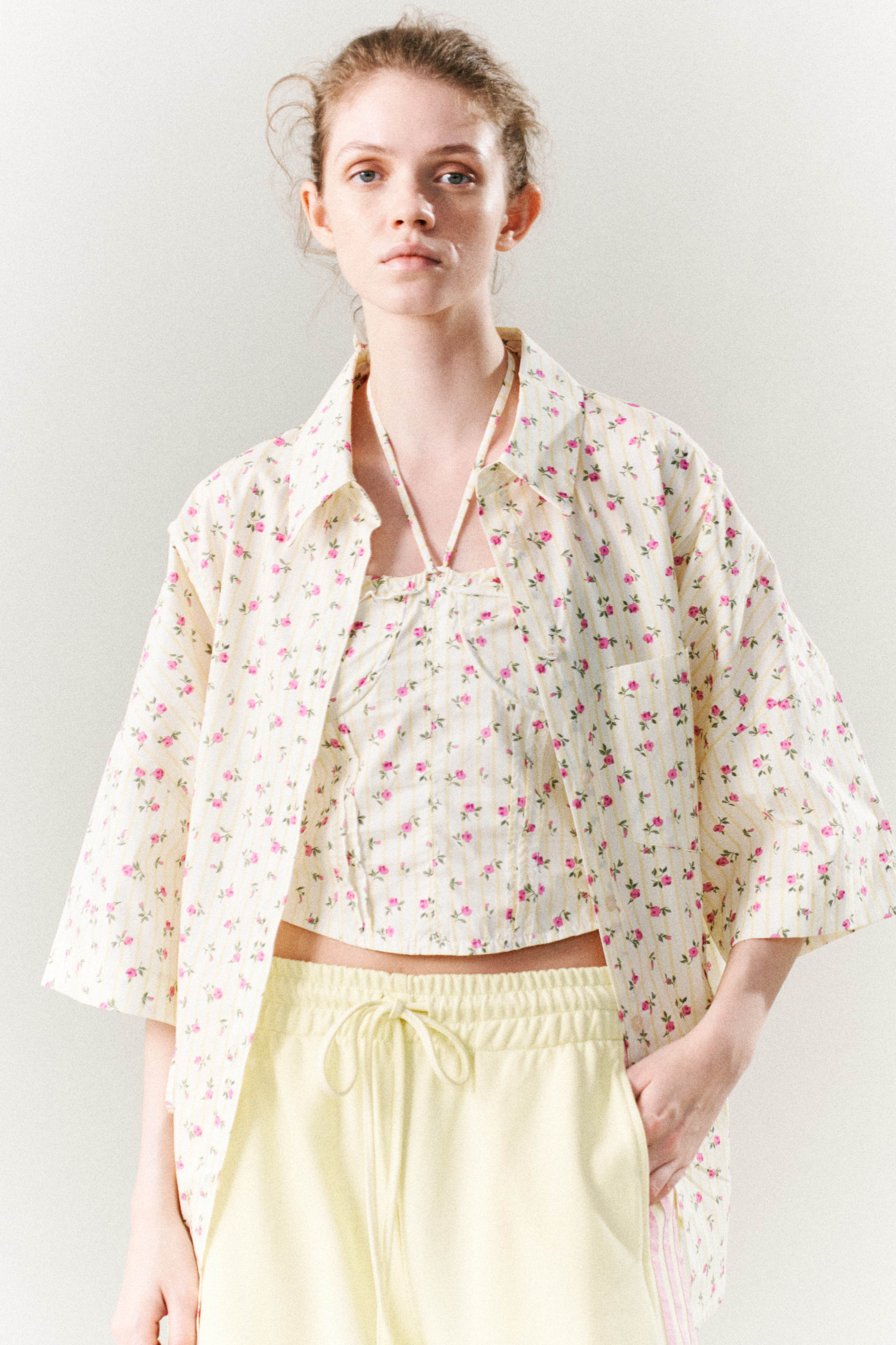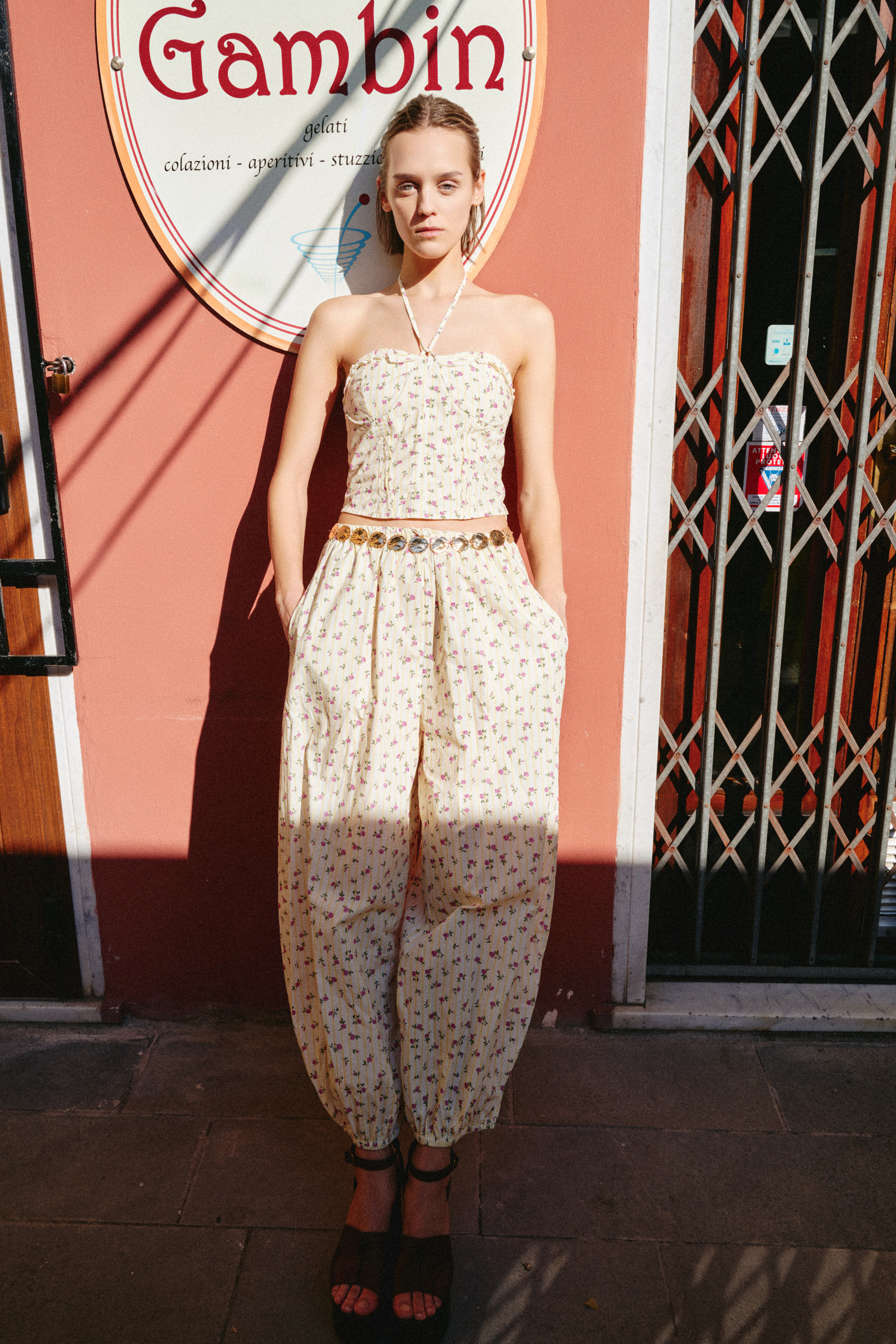 Pantaloni a righe con stampa floreale.