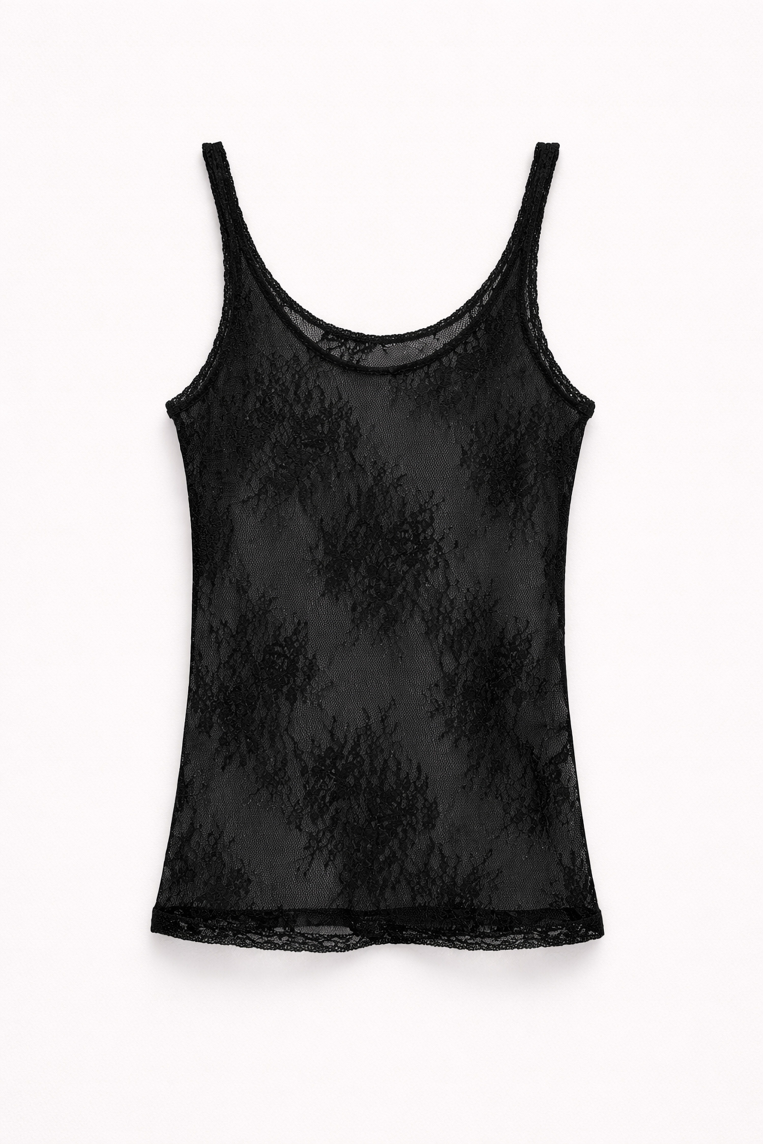Top canotta a costine elasticizzata in misto seta. Scollo ampio, spalline larghe, fondo dritto rifiniti con inserti in pizzo. Chiusura frontale con bottoni con inserti in pizzo laterali. Vestibilità regolare, disponibile in taglia S/M, M/L.