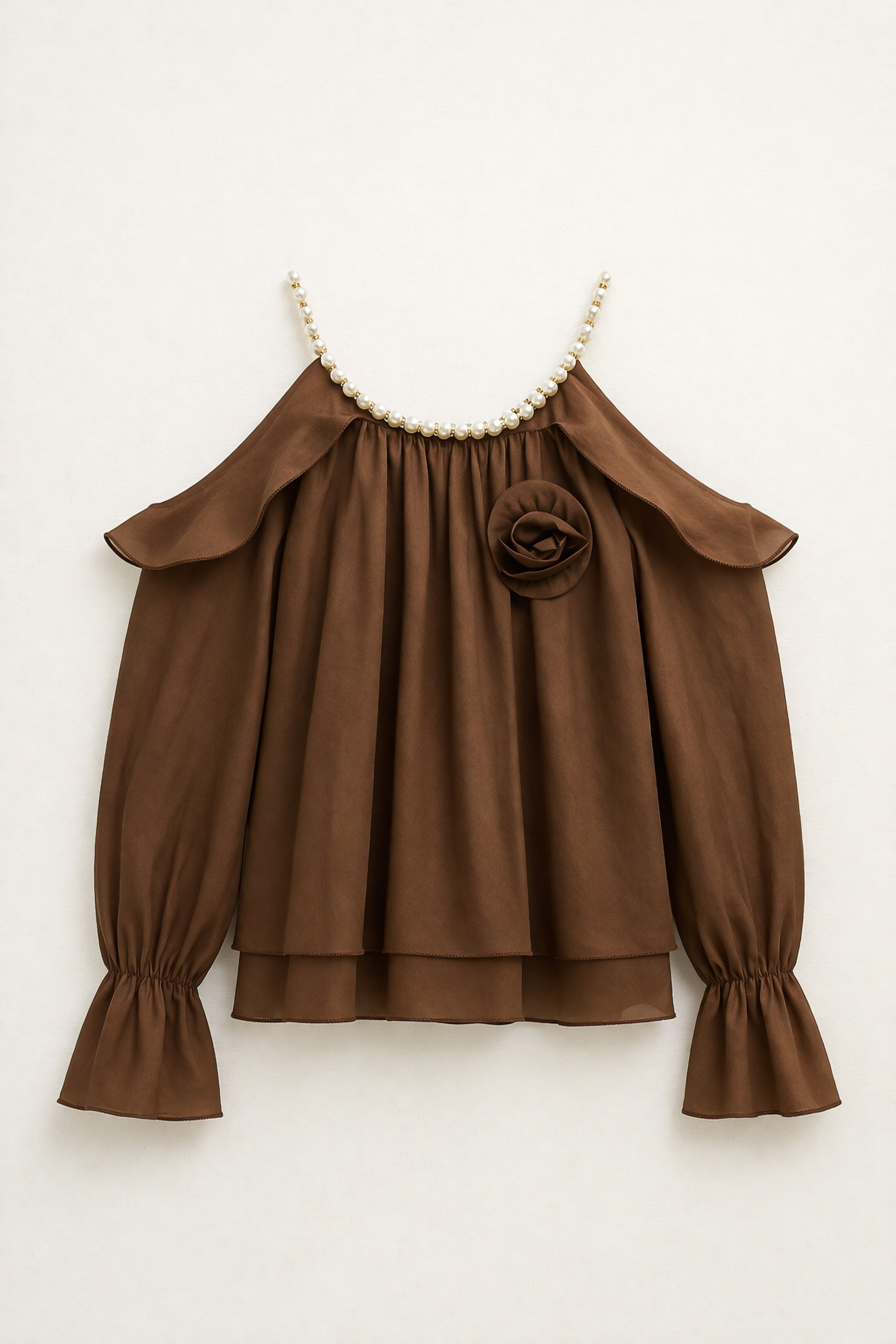 Dettaglio spalline gioiello con perle decorative applicate.