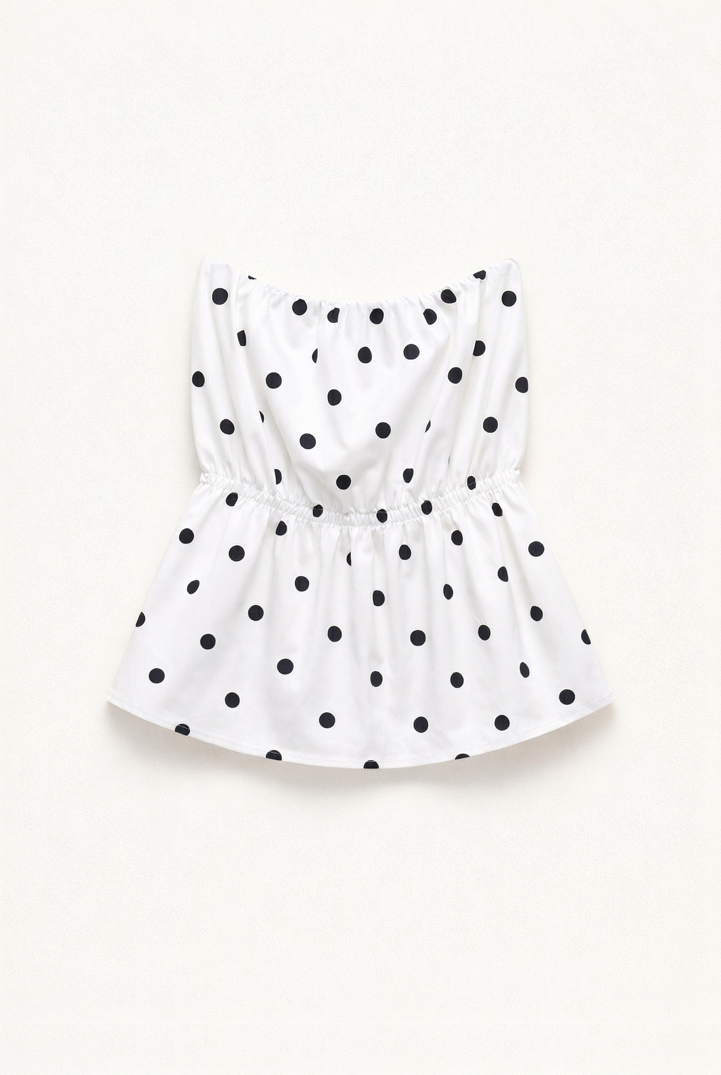 Top in misto cotone con stampa a pois. Scollo off shoulder elasticizzato e arricciato. Balza sul fondo effetto svasato. Vestibilità regolare, disponibile in taglia S/M, M/L.
