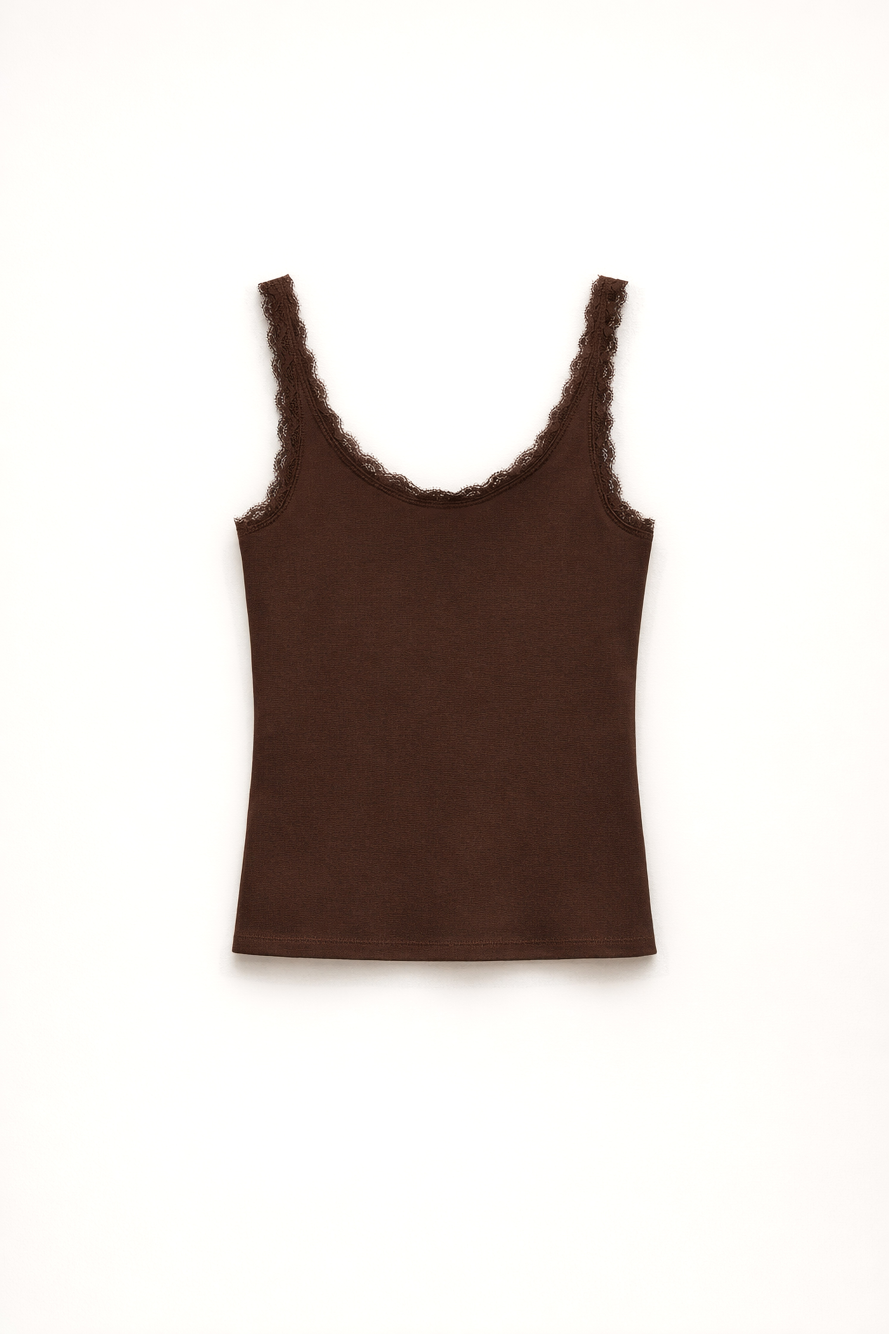 Top in pizzo con motivo geometrico. Scollo dritto con bordo rifinito e arricciato. Spalline sottili regolabili. Fodera interna. Vestibilità regolare, disponibile in taglia S, M, L.