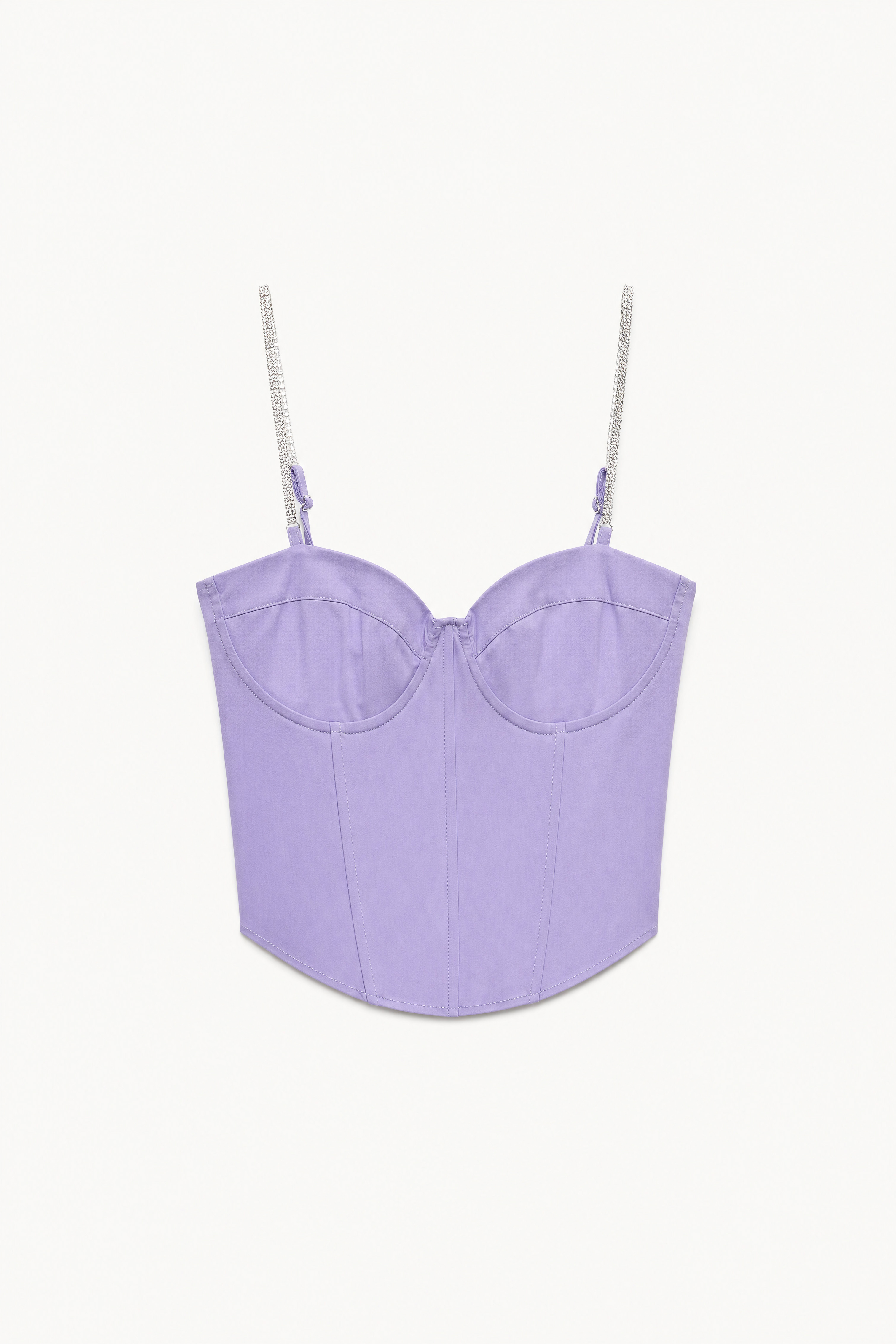 Top bustier in tessuto liscio e strutturato. Scollo a cuore con coppe preformate. Spalline sottili regolabili con inserto gioiello. Chiusura laterale con zip invisibile. Vestibilità regolare, disponibile in taglia S, M, L.