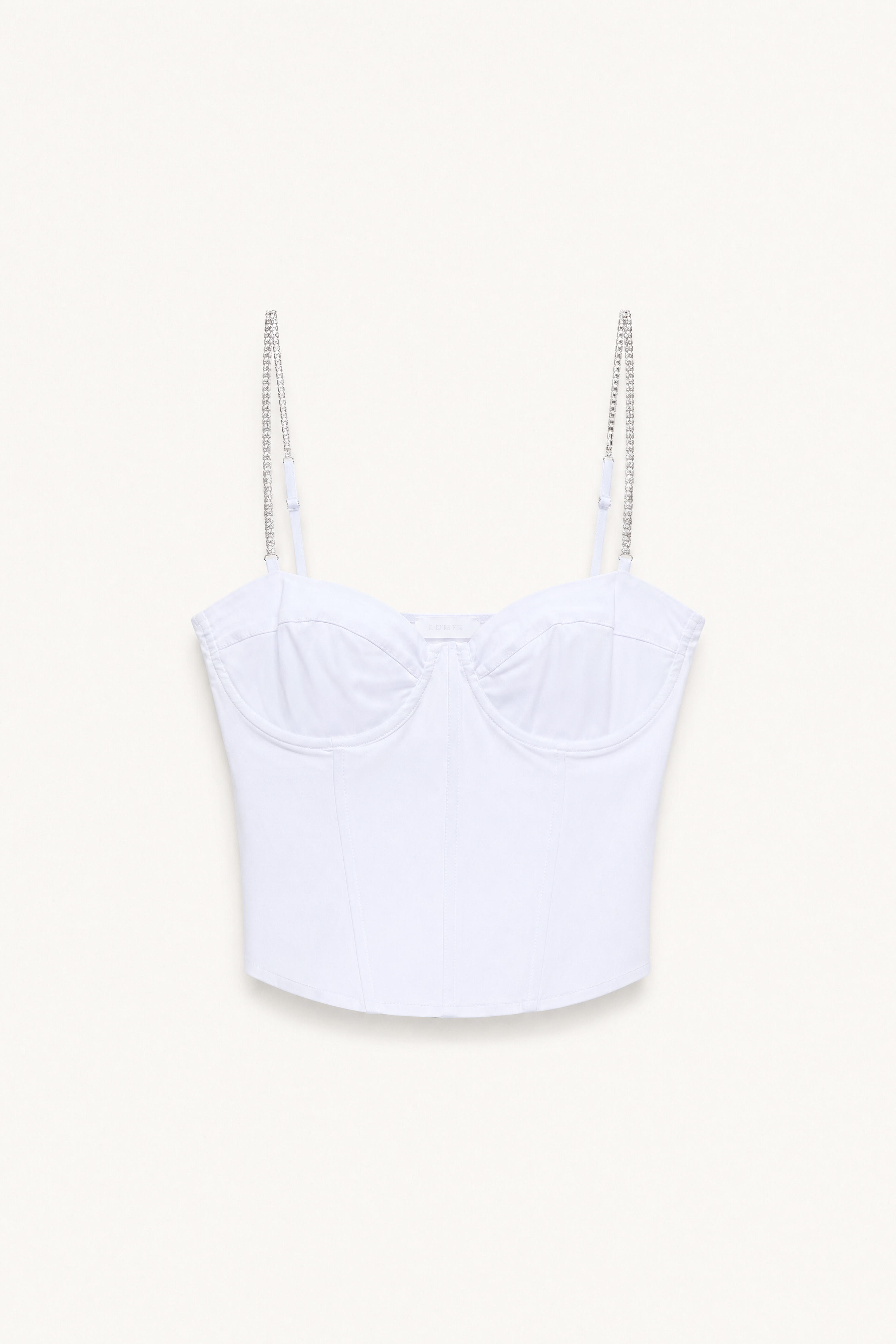 Top bustier in tessuto liscio e strutturato. Scollo a cuore con coppe preformate. Spalline sottili regolabili con inserto gioiello. Chiusura laterale con zip invisibile. Vestibilità regolare, disponibile in taglia S, M, L.
