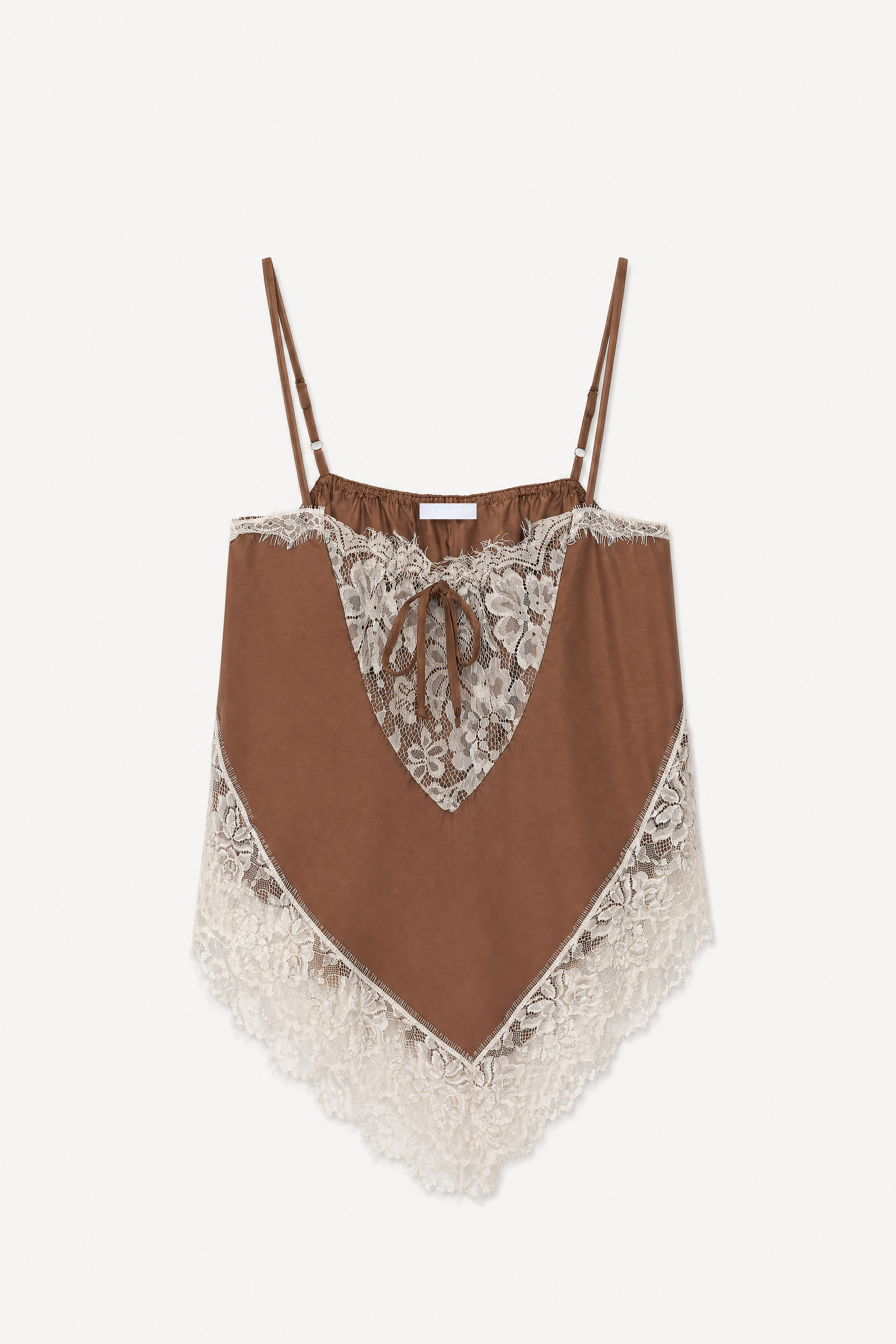 Top in tessuto satinato misto lyocell. Inserti in pizzo floreale con finiture sfrangiate. Scollo dritto arricciato con coulisse regolabile. Spalline sottili regolabili con anelli metallici. Costruzione con balze sovrapposte sul fondo. Vestibilità regolare, disponibile in taglia S/M, M/L.
