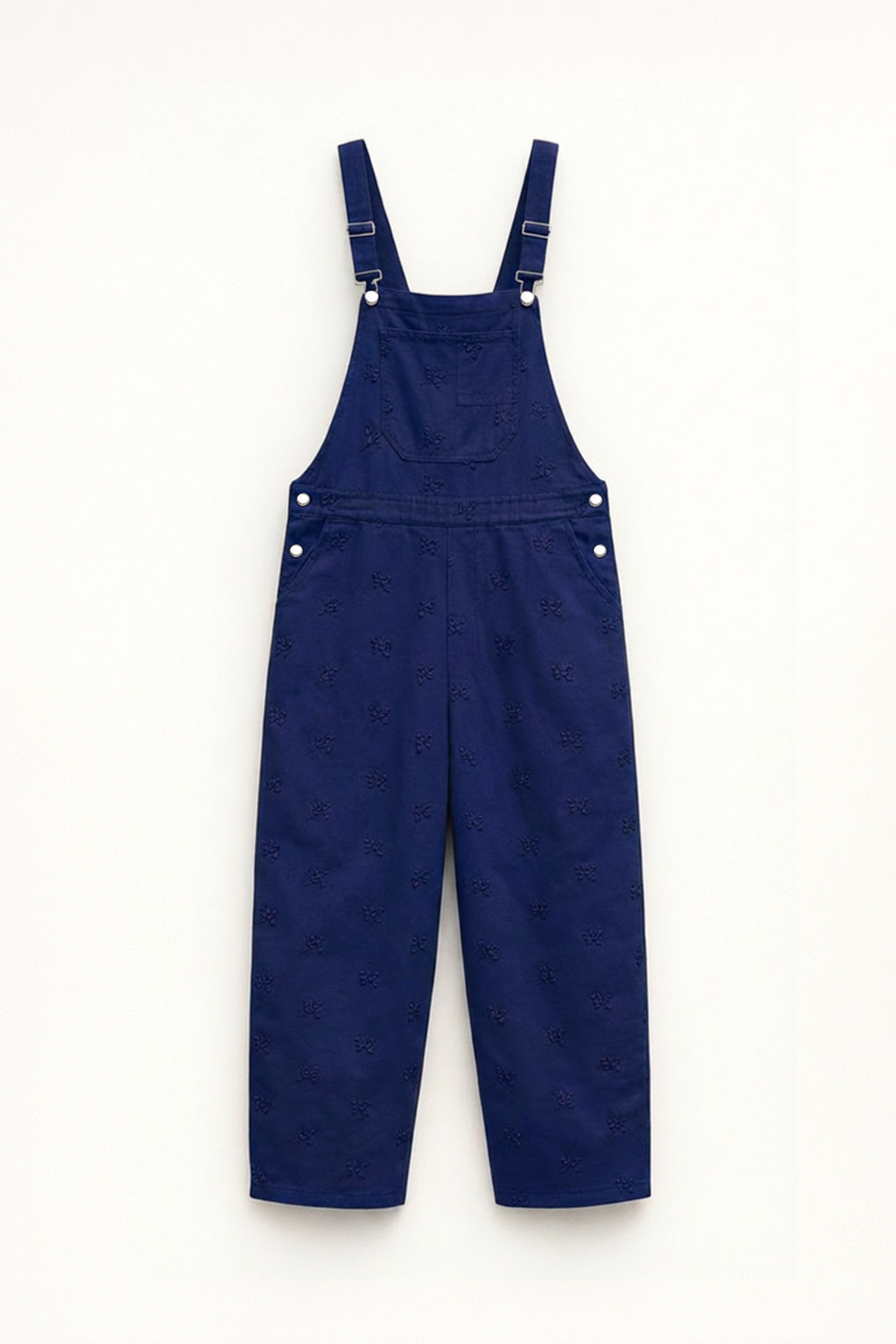 Salopette in cotone con ricami floreali in rilievo. Pettorina frontale con tasca applicata. Spalline regolabili con fibbie metalliche. Tasche laterali inserite con bottoni funzionali sui fianchi. Tasche posteriori applicate. Fodera interna. Vestibilità regolare, disponibile in taglia S, M, L.