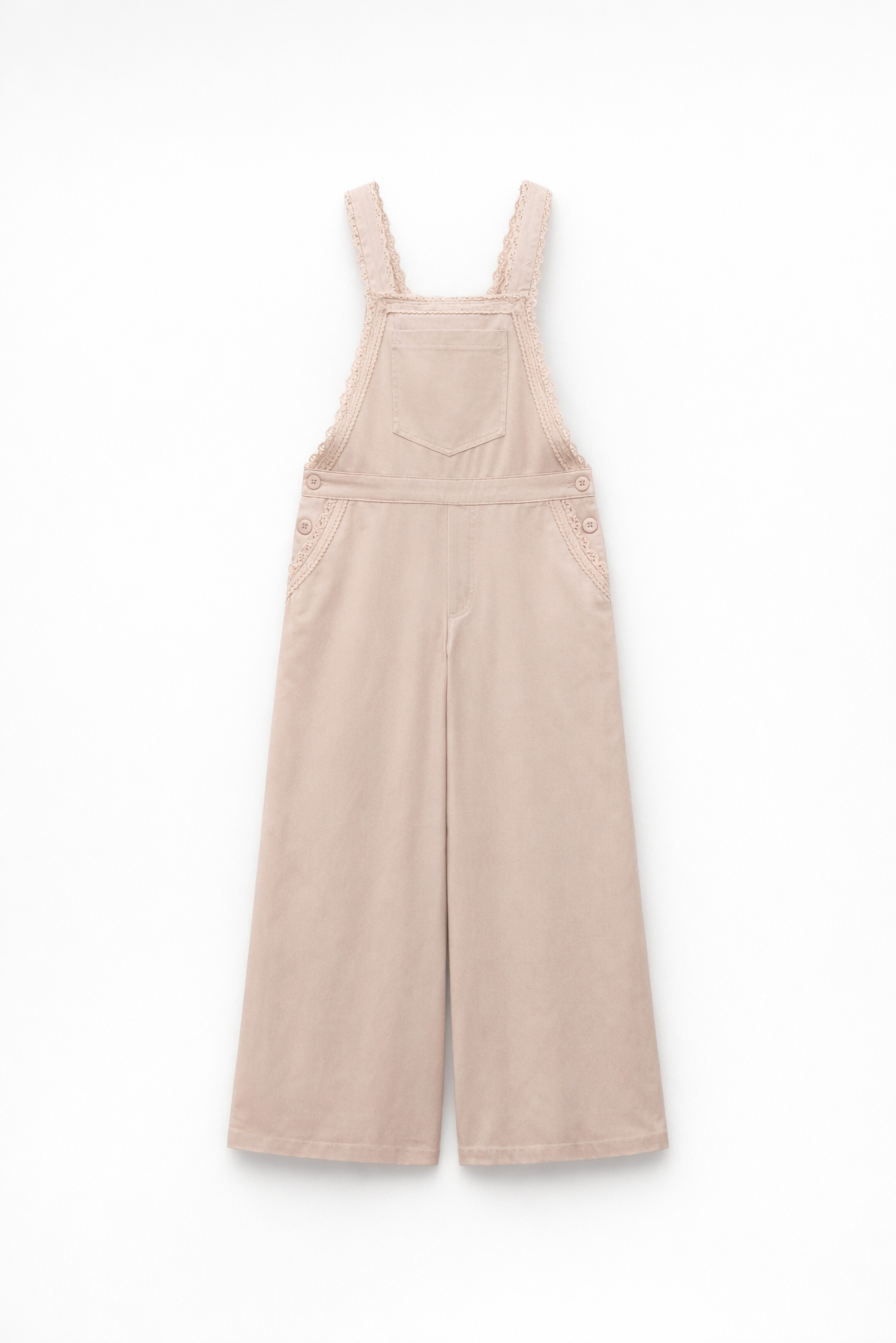 Salopette con bretelle larghe con inserto in pizzo. Tasca applicata centrale sul petto. Inserto in pizzo lungo i lati. Tasche laterali inserite con bottoni decorativi sui fianchi. Tasche posteriori applicate. Chiusura laterale con bottoni. Vestibilità regolare, disponibile in taglia S, M, L.