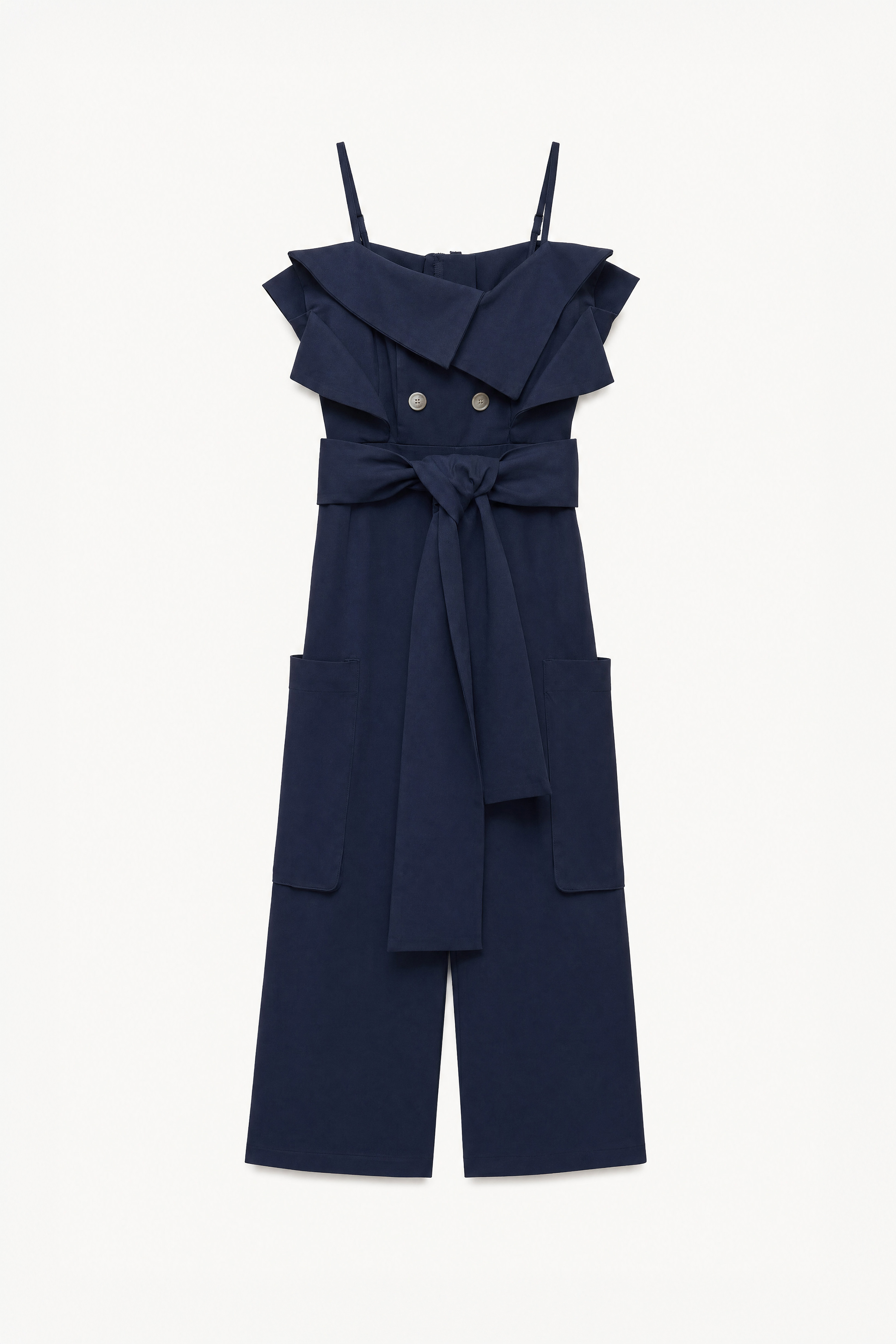 Tuta con scollo ampio e risvoltato e spalline sottili regolabili. Corpetto con bottoni decorativi e funzionali. Vita con passanti e cintura coordinata. Maxi tasche stile cargo applicate frontali. Chiusura posteriore con zip metallica nascosta. Vestibilità regolare, disponibile in taglia S/M, M/L.
