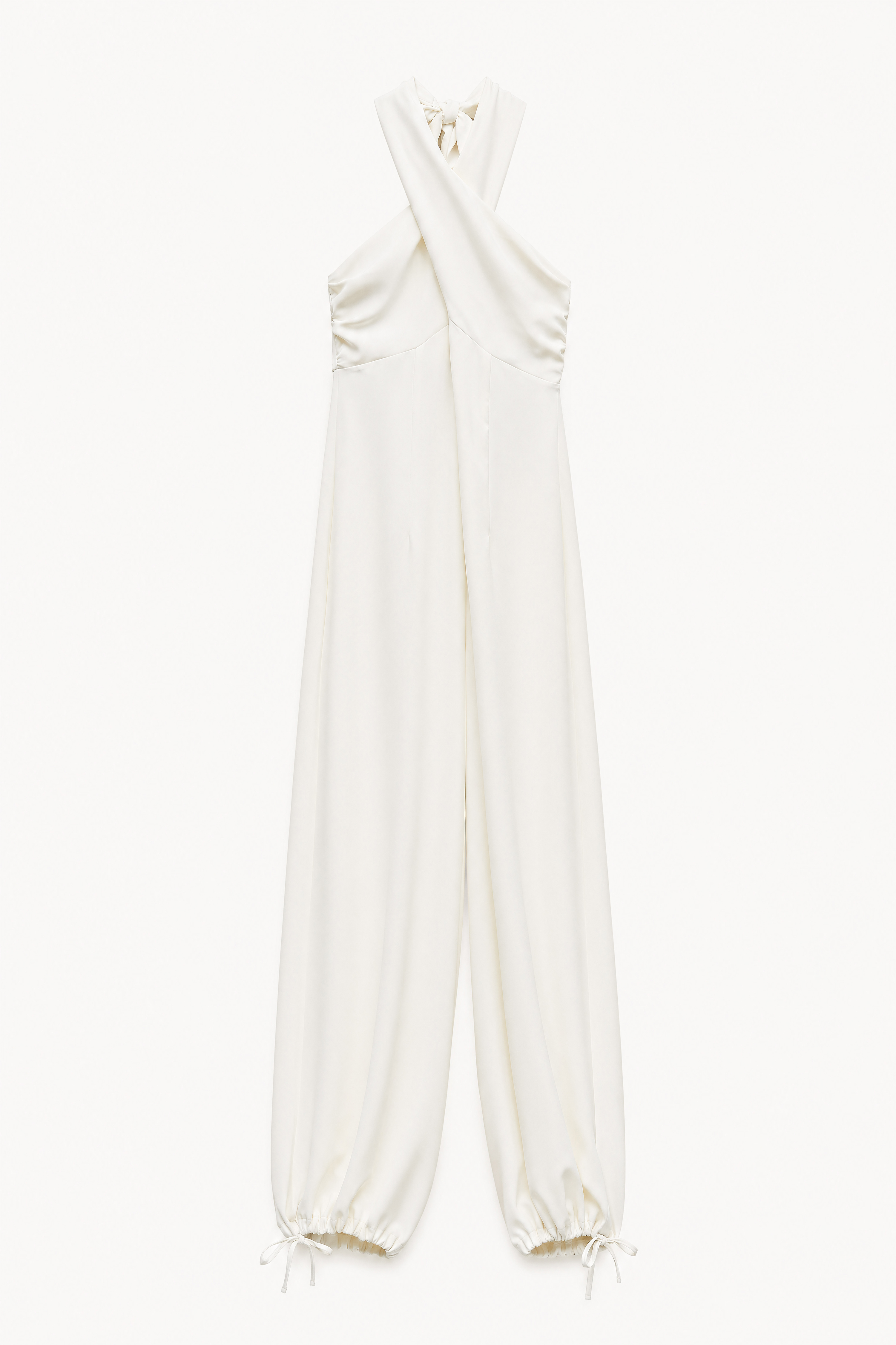 Tuta con scollo a cuore con coppe preformate. Spalline sottili regolabili. Costruzione con cuciture sagomate. Retro con dettaglio cut-out e chiusura con gancetti interni. Chiusura principale con zip posteriore invisibile. Pantalone lungo a gamba ampia e linea fluida. Vestibilità regolare, disponibile in taglia S, M, L.