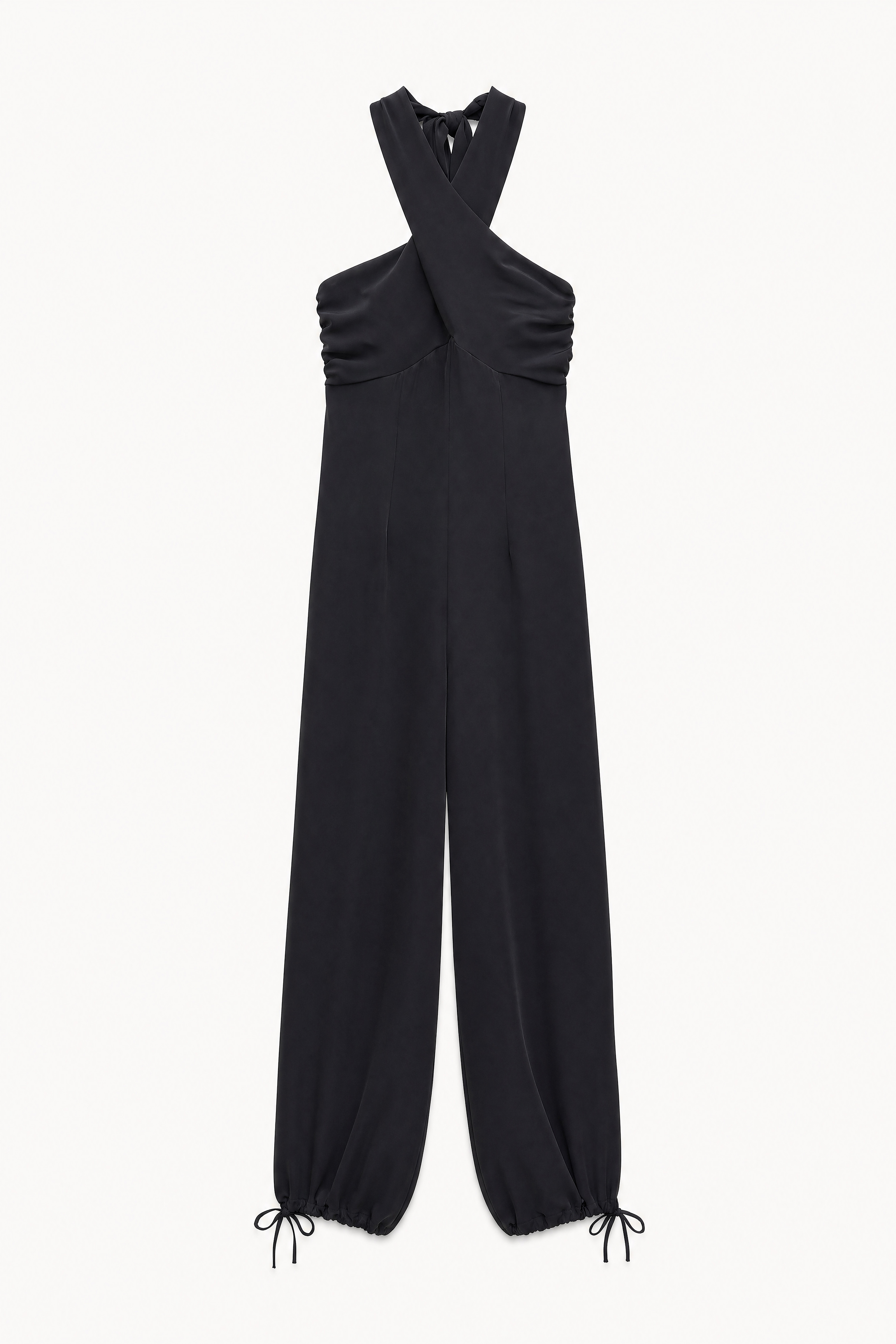 Salopette in tessuto satinato 100% rayon. Scollo a V incrociato. Colletto ampio. Pantalone lungo a gamba ampia e fluida. Tasche laterali inserite. Fodera interna. Vestibilità regolare, disponibile in taglia S, M, L.