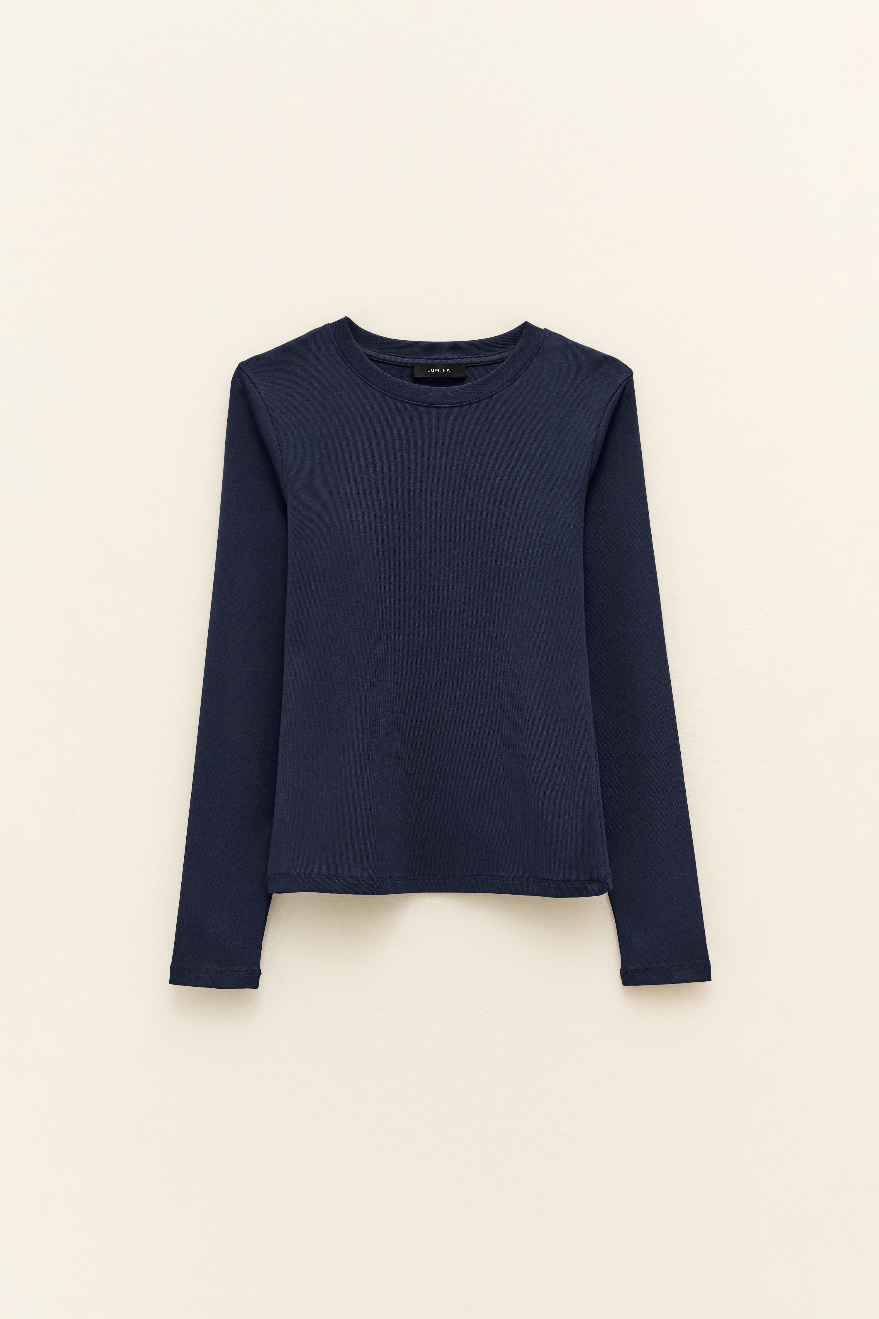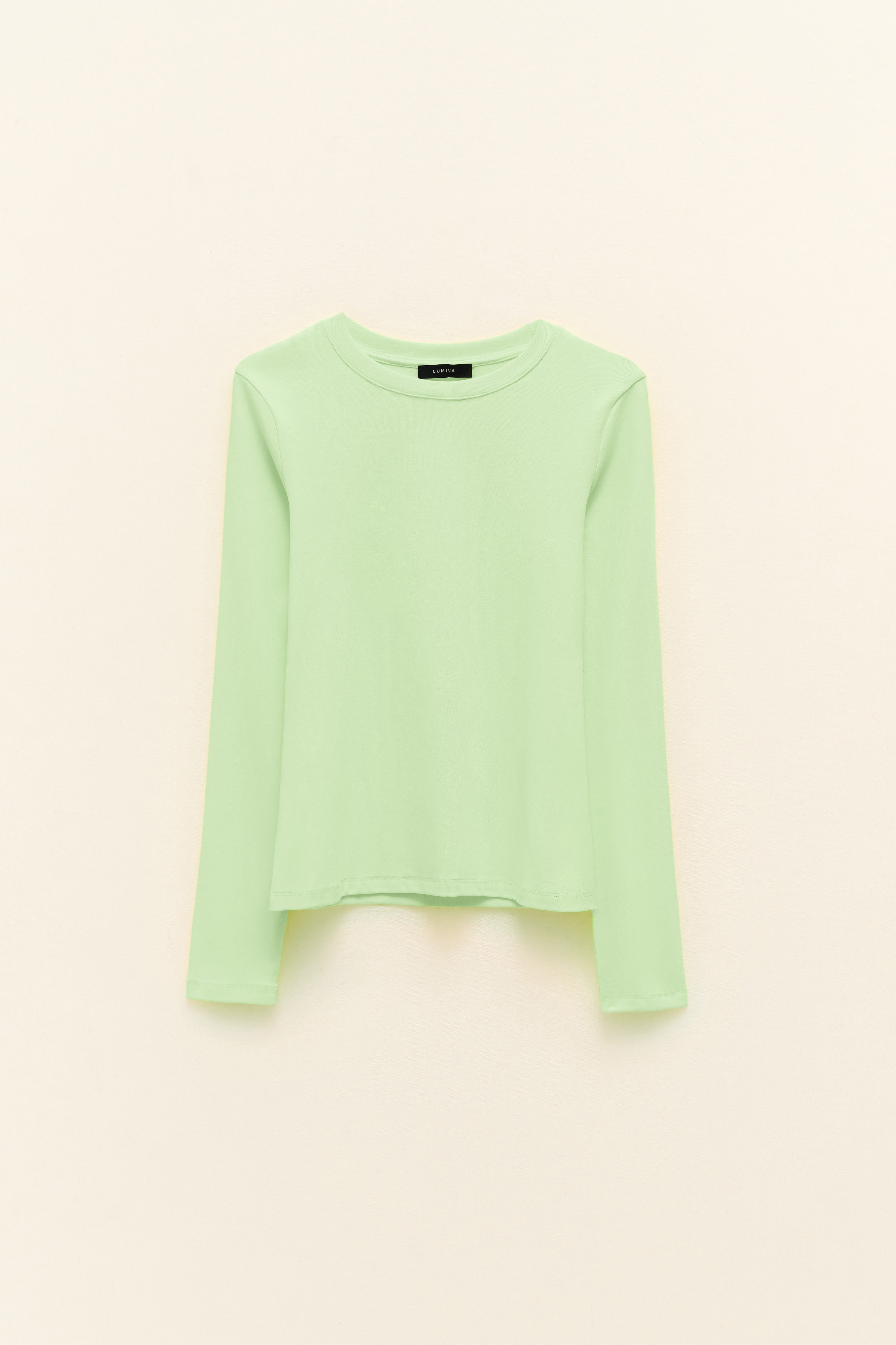 It has long sleeves and a round neck.