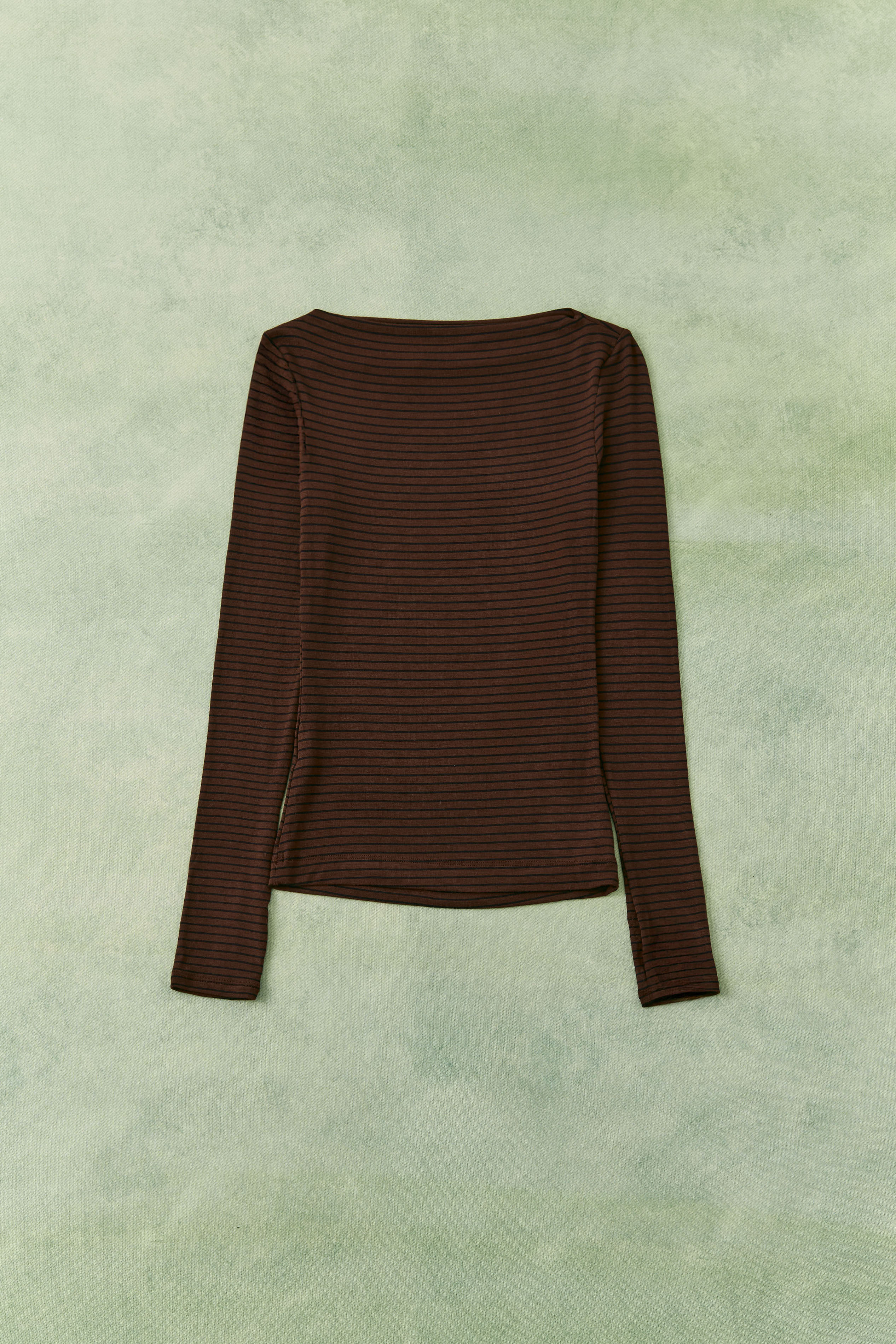 Long sleeves. Features a boat neckline.