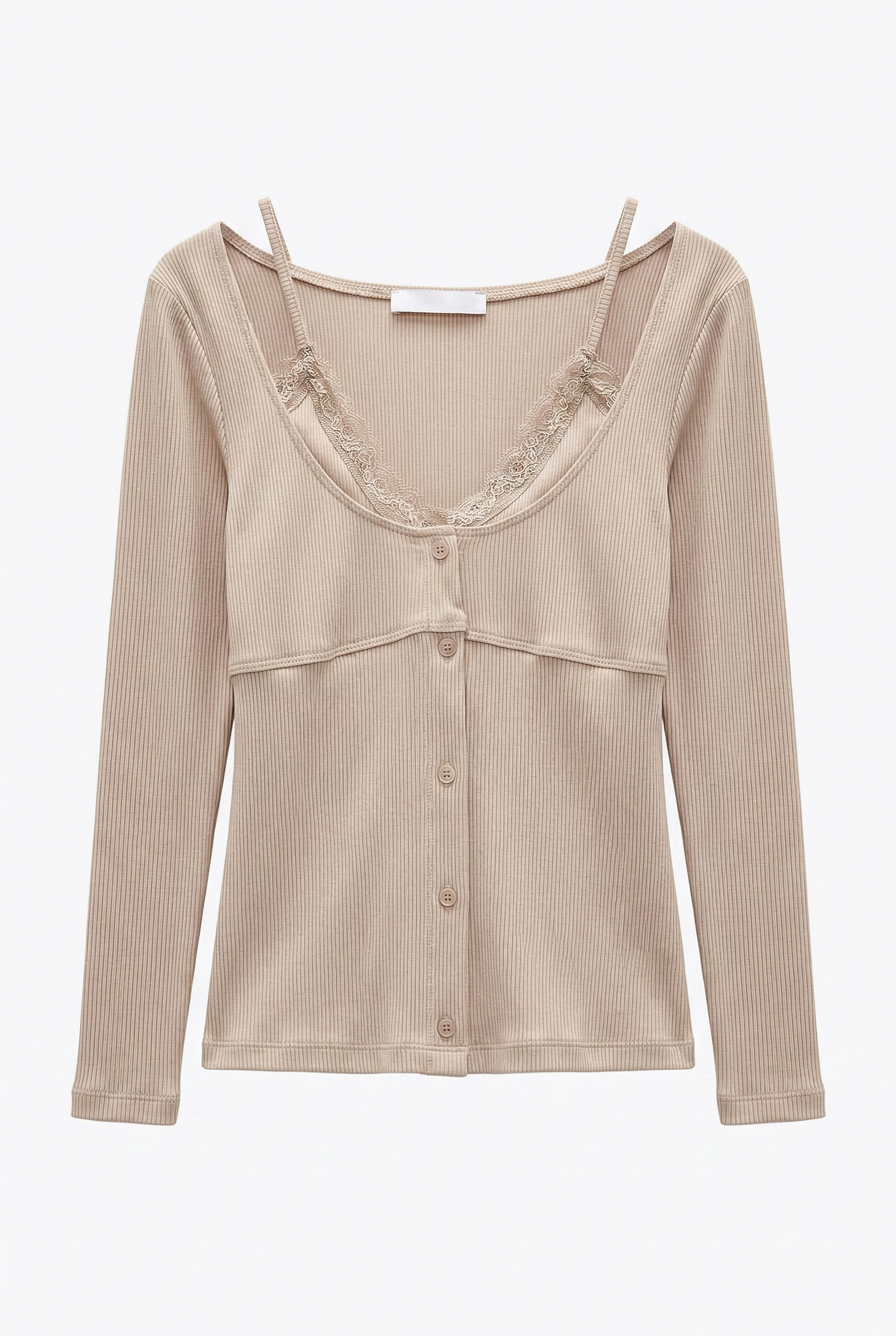 Wide U-neck detail with lace insert.