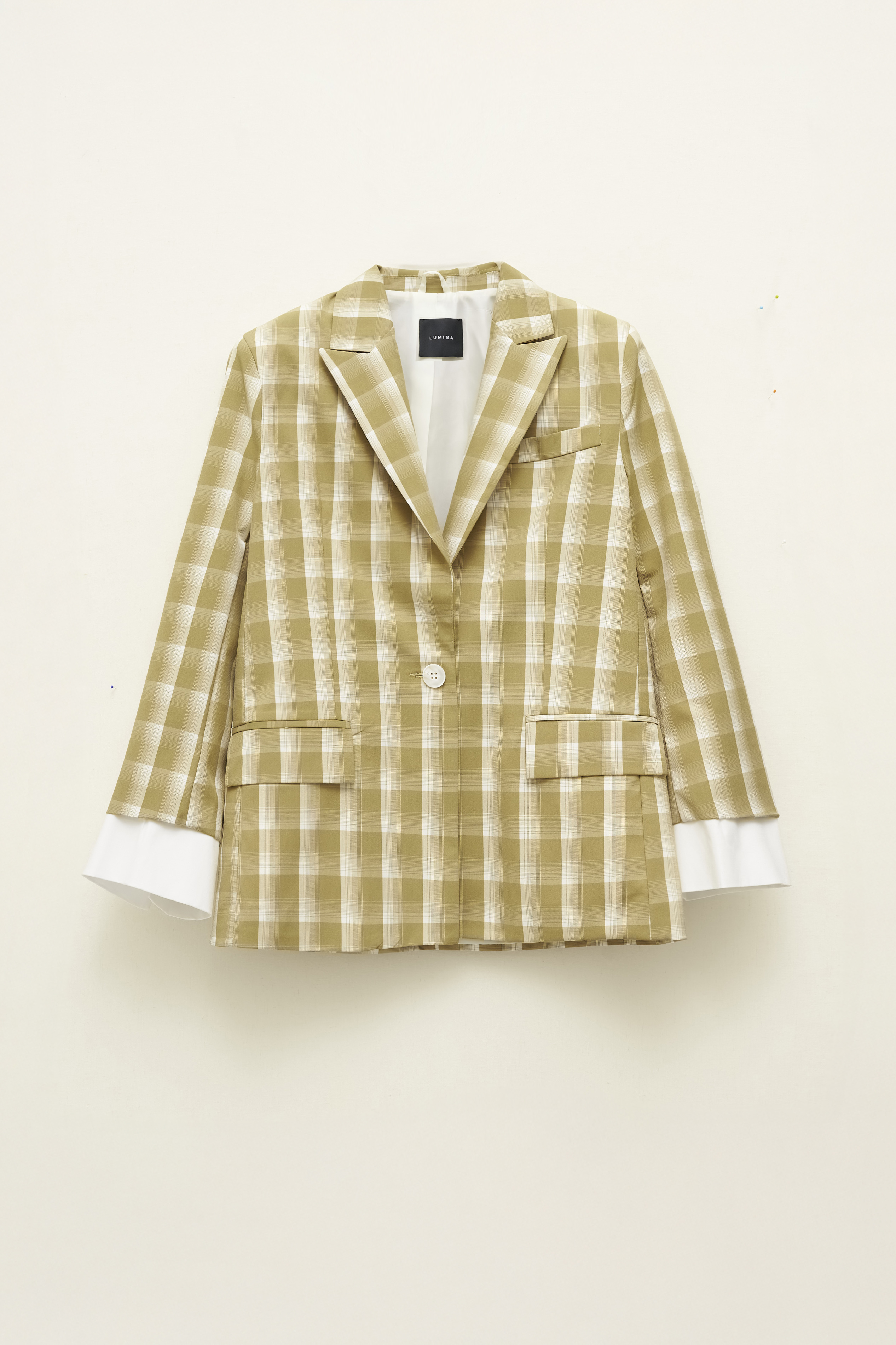 Classic lapel collar. Long sleeves with contrasting cuffs.
