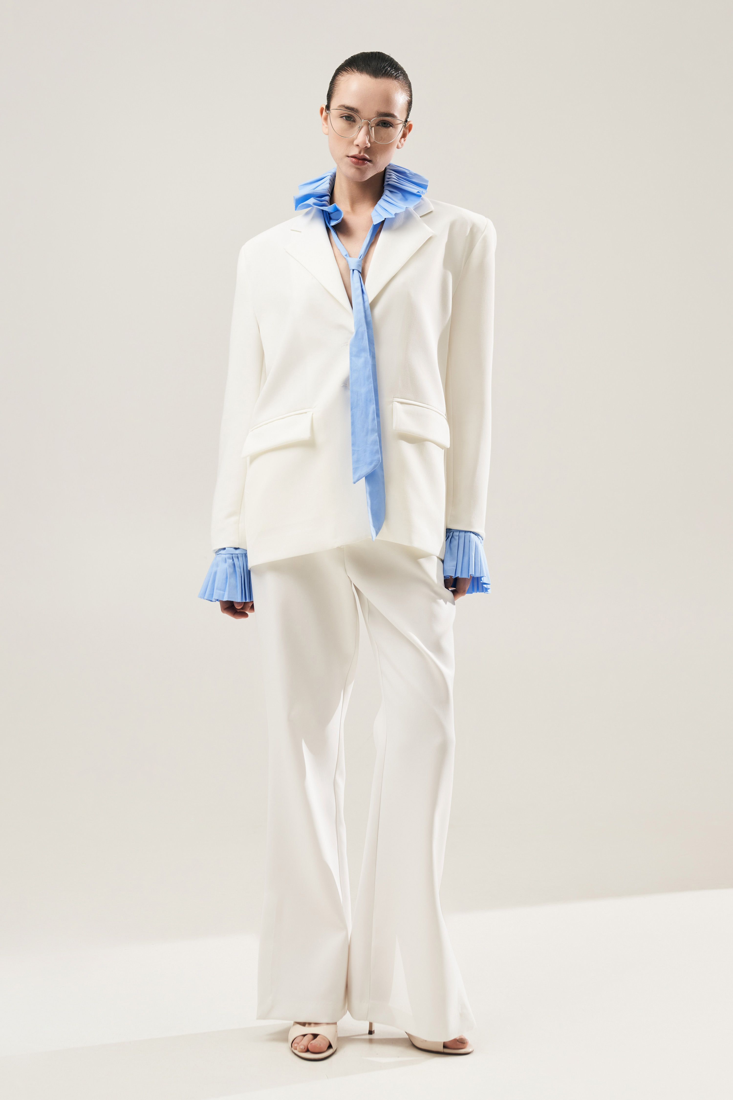 Long sleeves and padded shoulders.