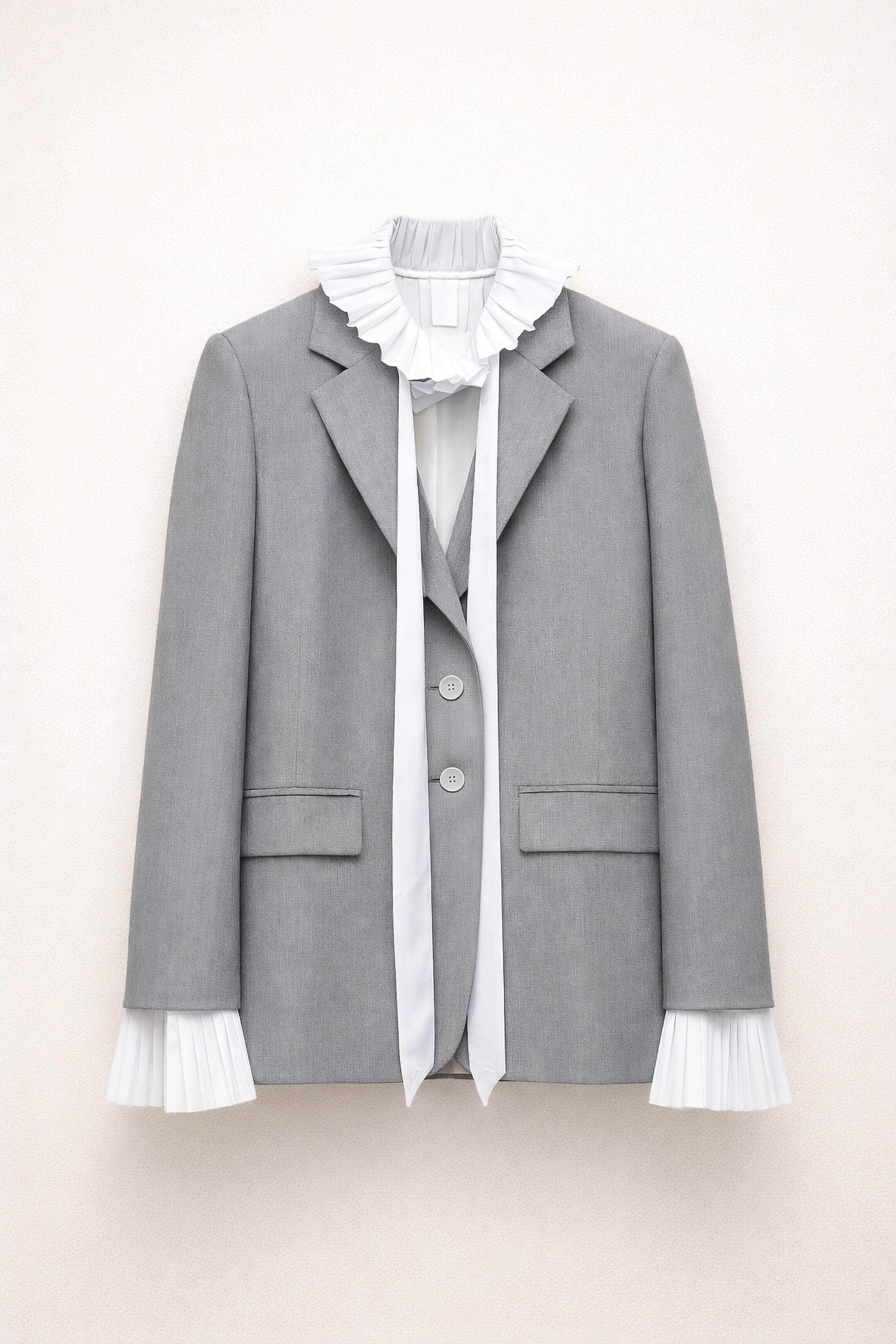 Classic lapel collar. Long sleeves with contrasting cuffs.