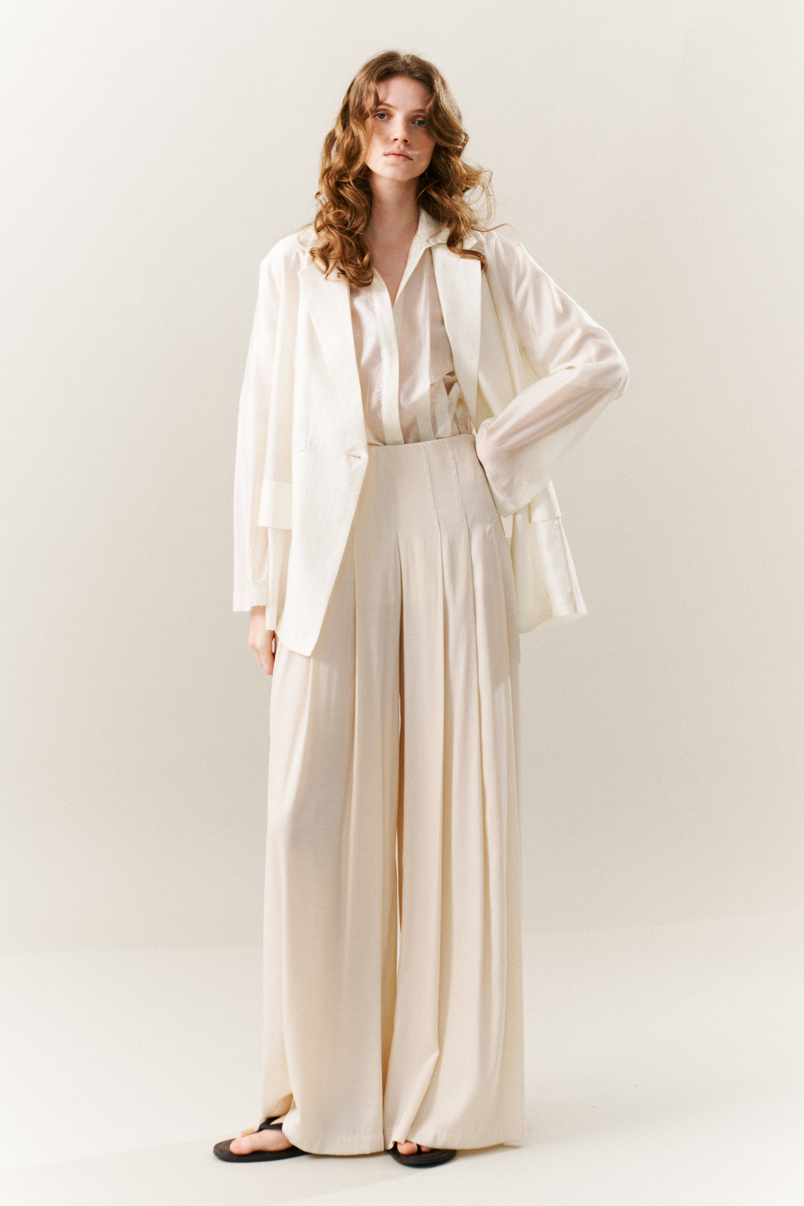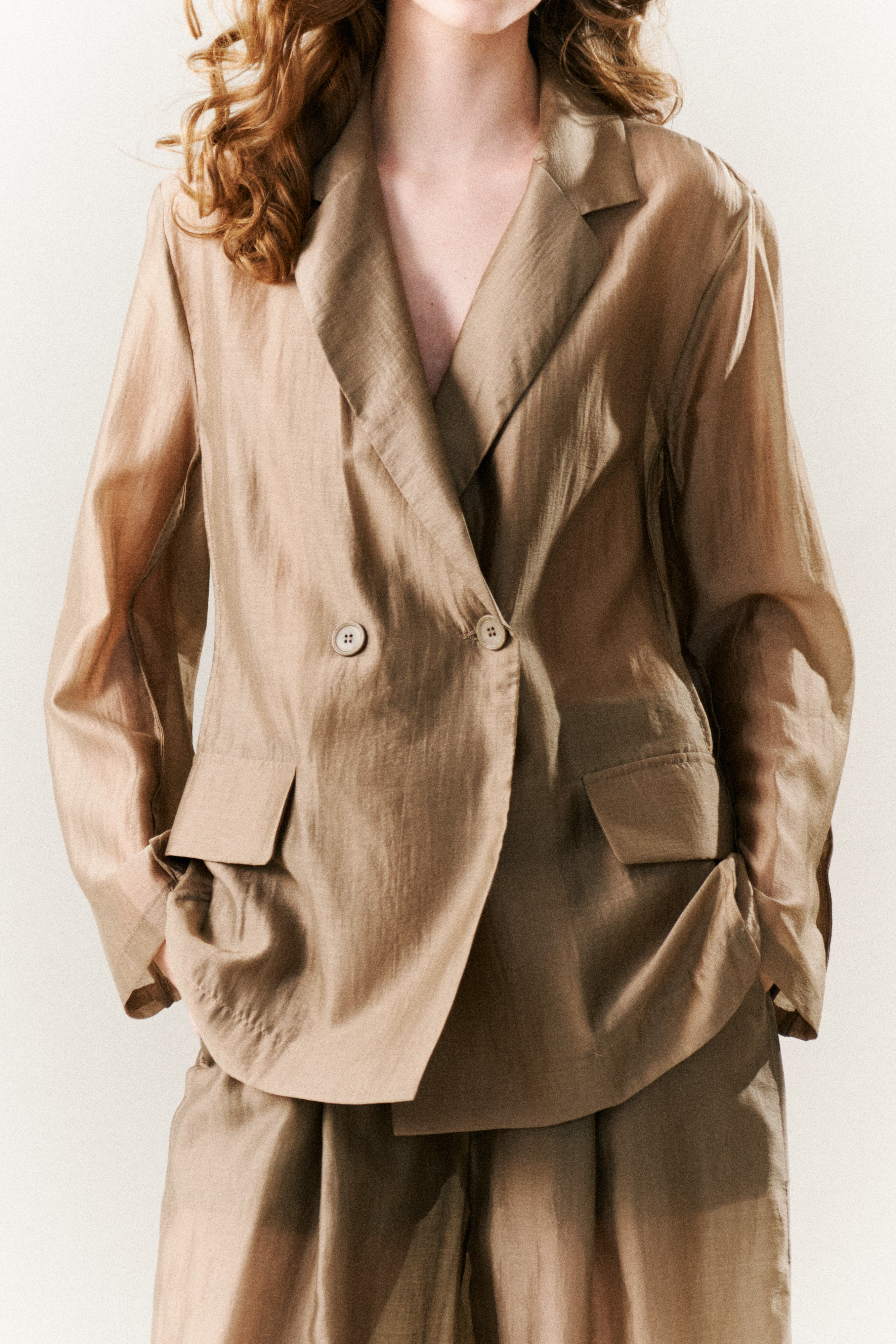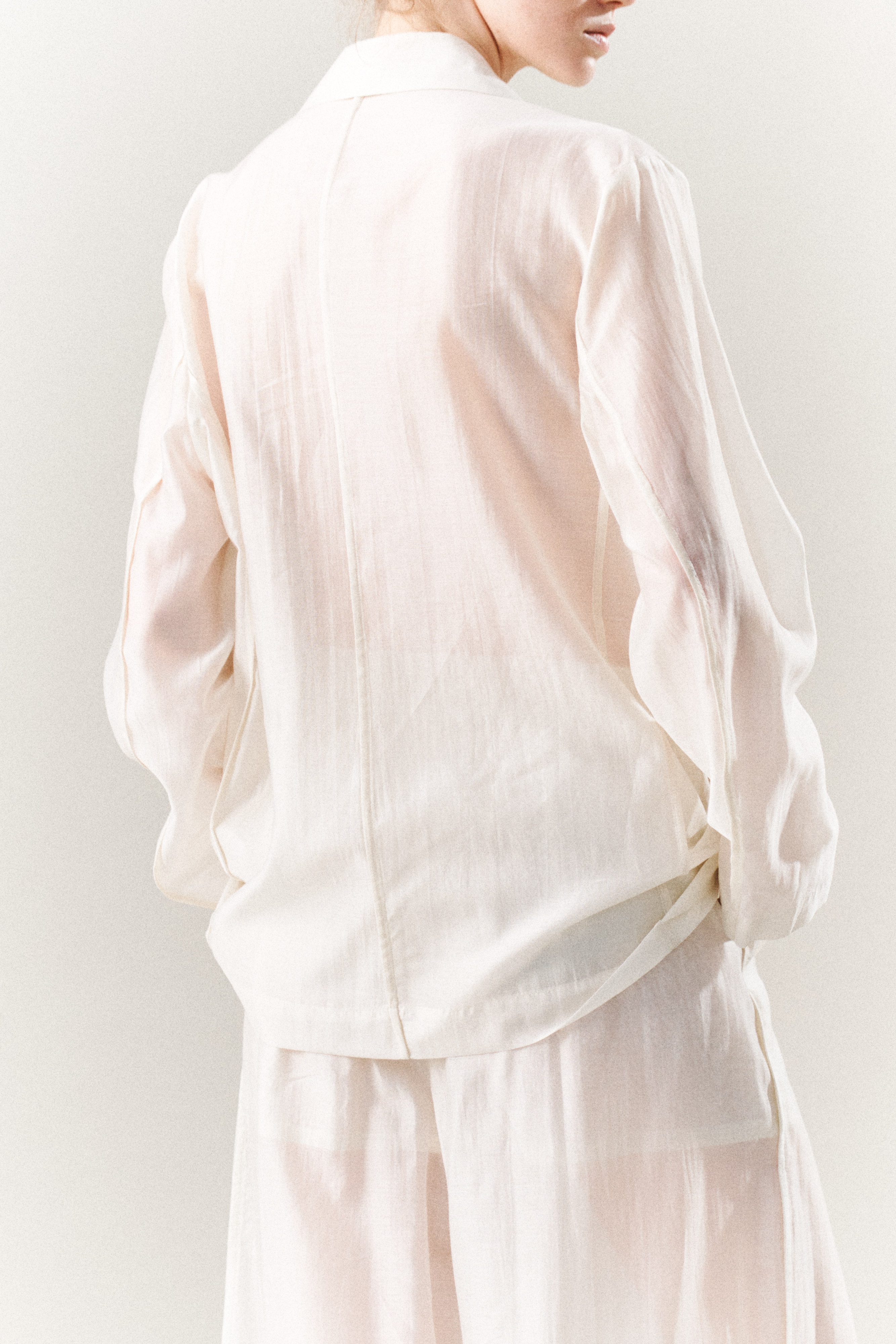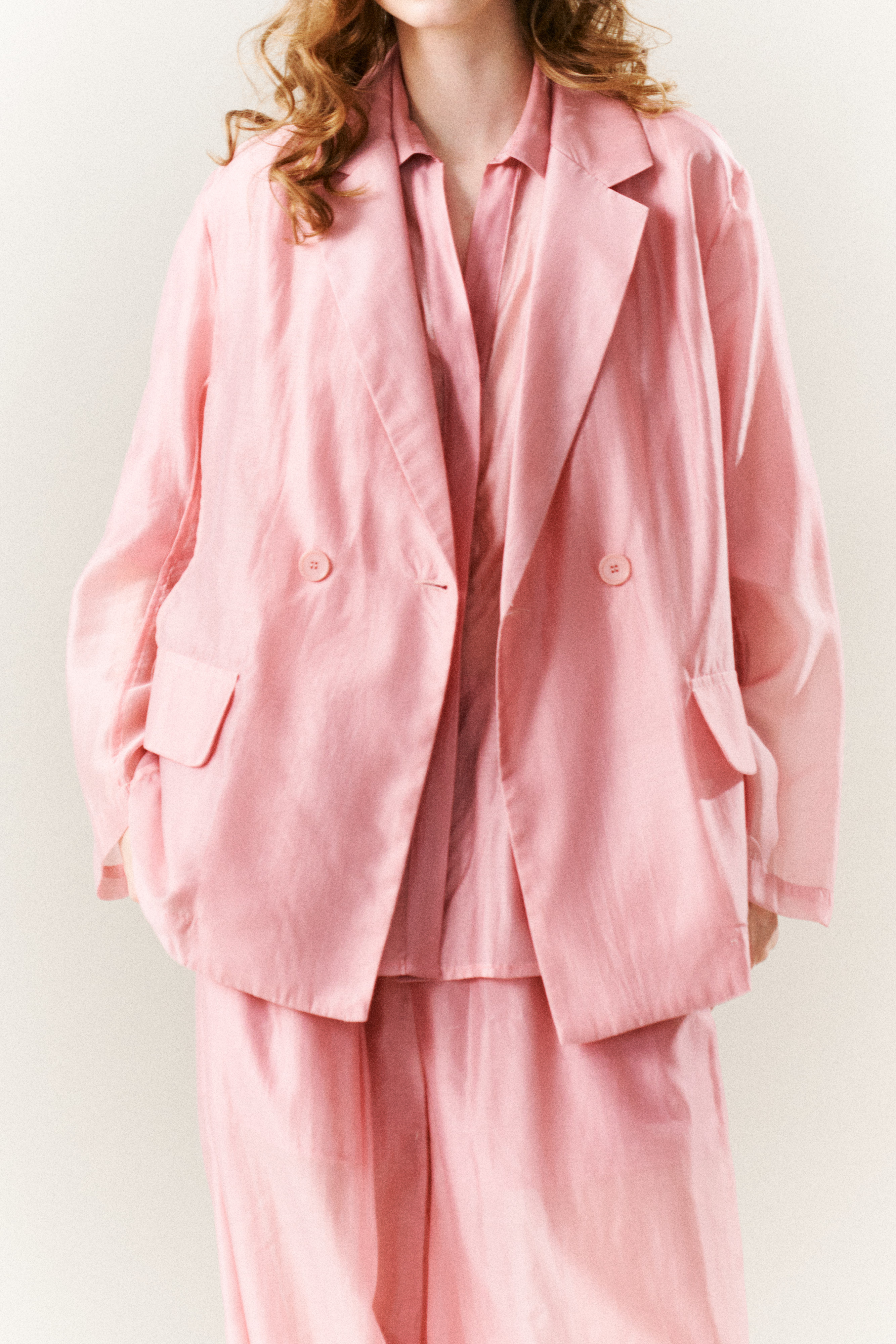 Classic lapel collar. Long sleeves with contrasting cuffs.