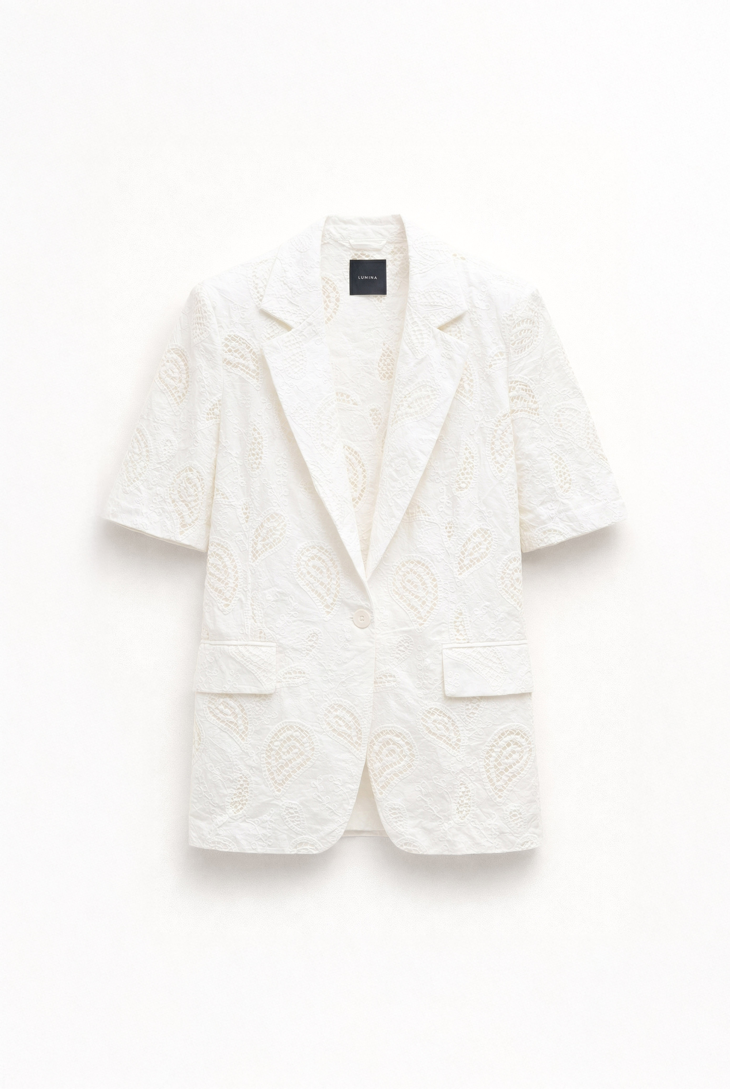Blazer with openwork embroidery and all-over decorative motif.