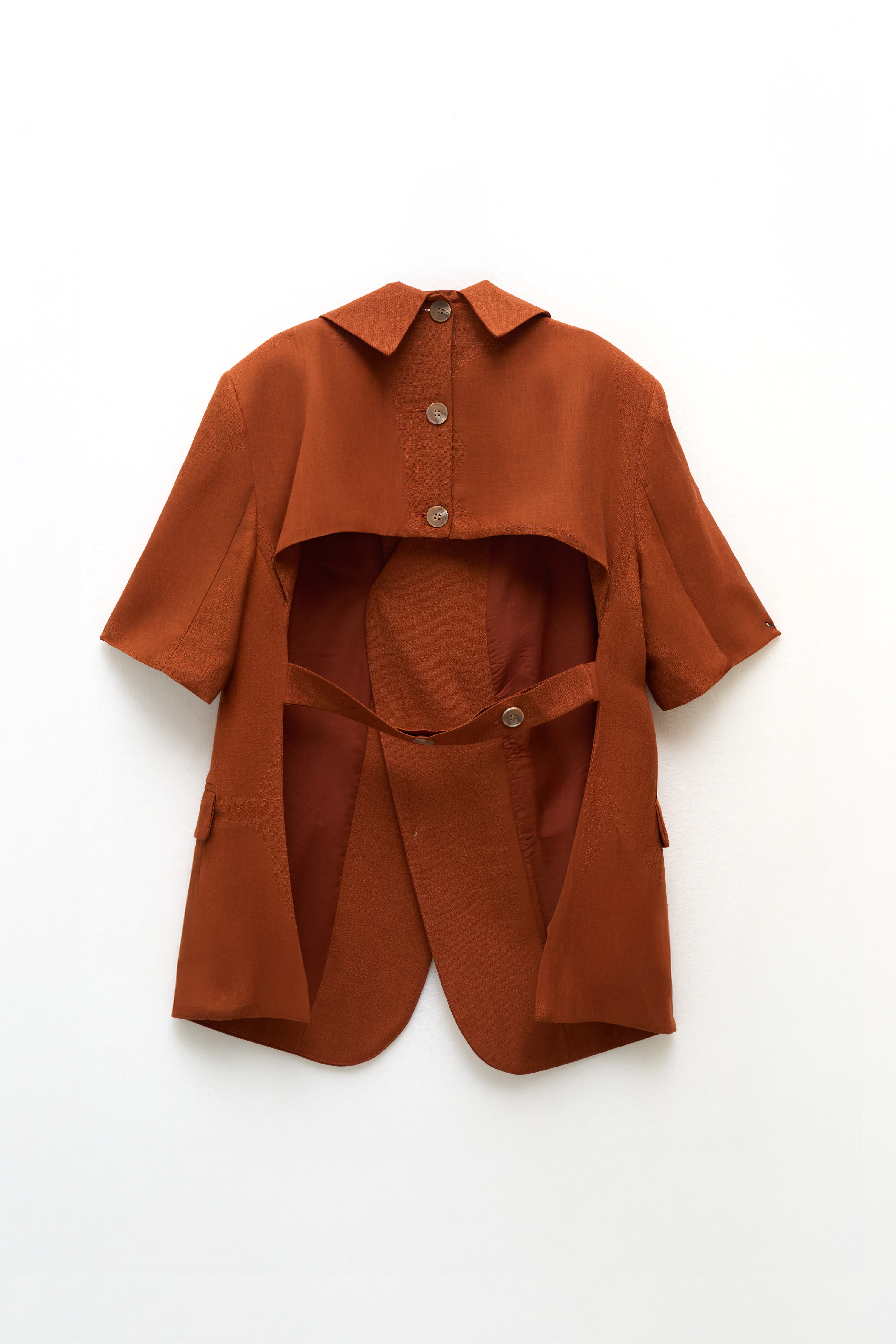 Single-breasted front closure with decorative knots.